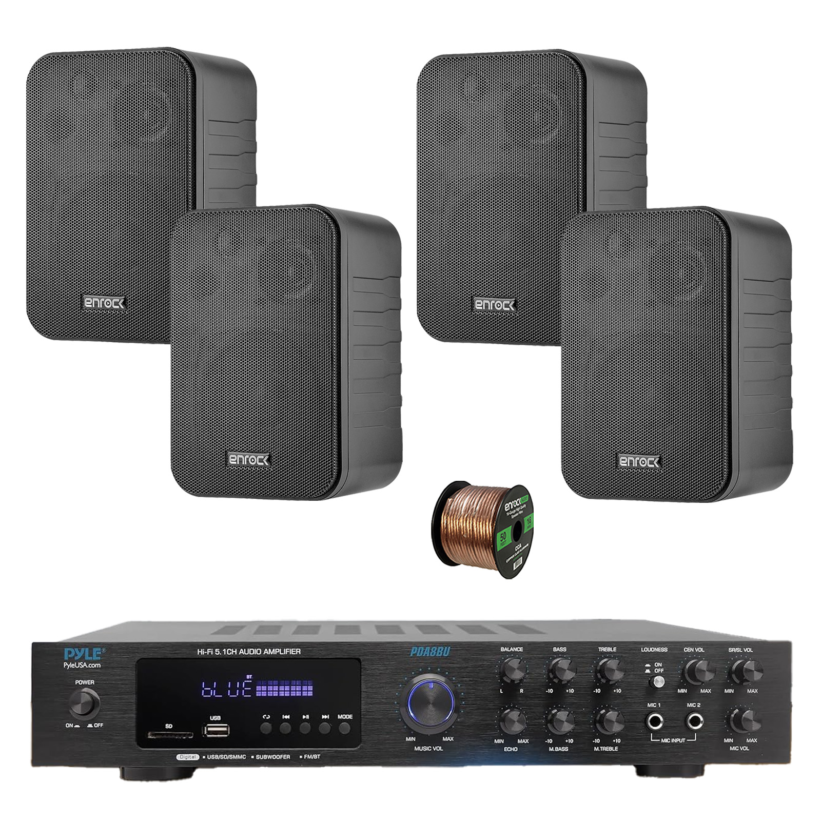 Pyle PDA8BU 5.1 Channel Home Audio Theater Bluetooth MP3/USB/SD/AUX/FM Radio Receiver, 4x 4" 30 Watt Peak 3-Way Water-Resistant Indoor/Outdoor Audio Speakers (Black), 50 ft 16 Gauge Speaker Wire