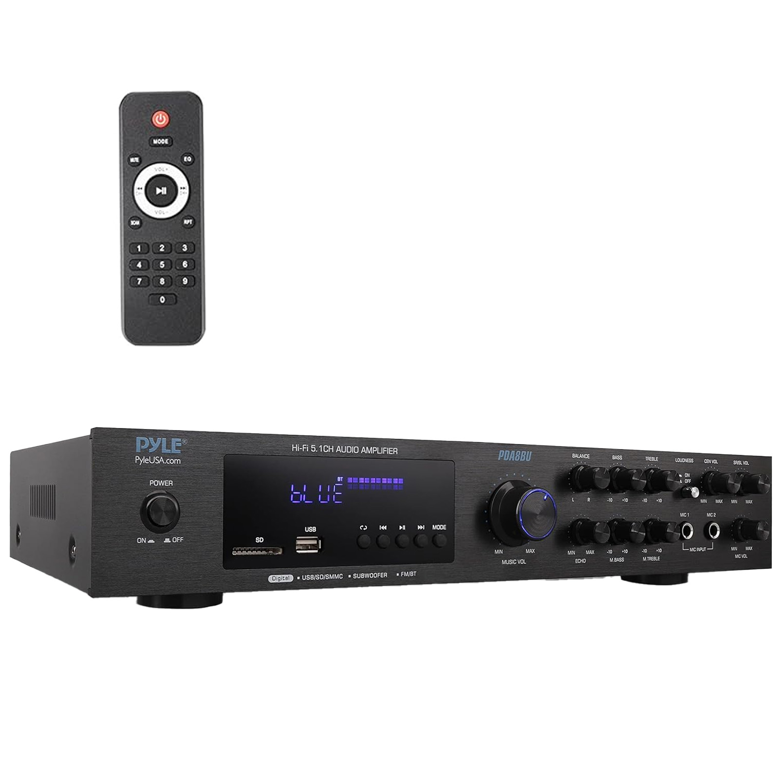 • RECEIVER: Pyle PDA8BU 5.1 Channel Amplifier System features a VFD screen display with Frequency level light, Built-in Bluetooth for Wireless Audio Streaming - Auto Scan, Memory, Radio Station PREVIOUS/NEXT Control - MP3 Digital Audio File Playback