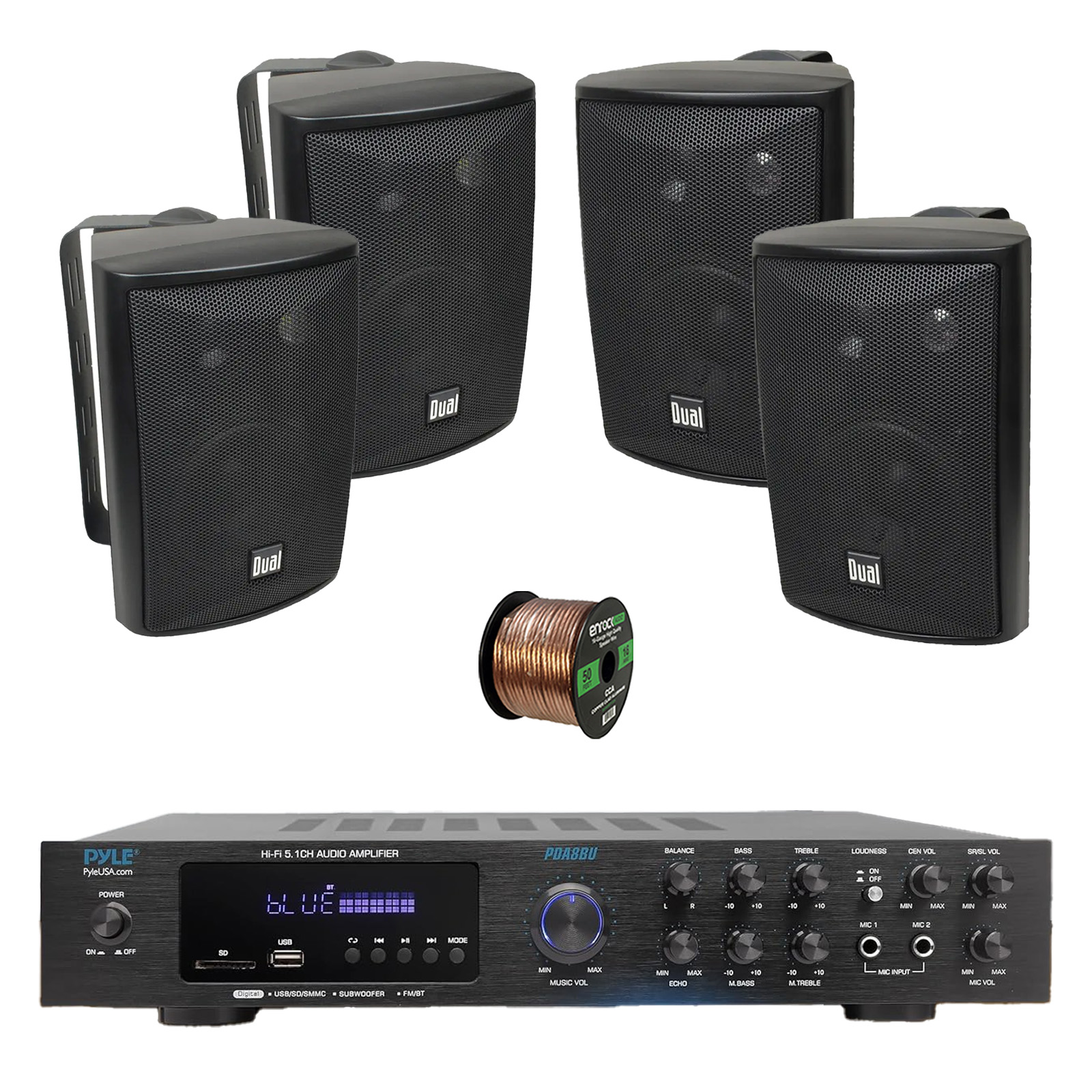 Pyle PDA8BU 5.1 Channel Home Audio Theater Bluetooth MP3/USB/SD/AUX/FM Radio Receiver, 4x 4" 200 Watt Max 3-Way Indoor/Outdoor Wall Mount Audio Speakers (Black), 50 ft 16 Gauge Speaker Wire
