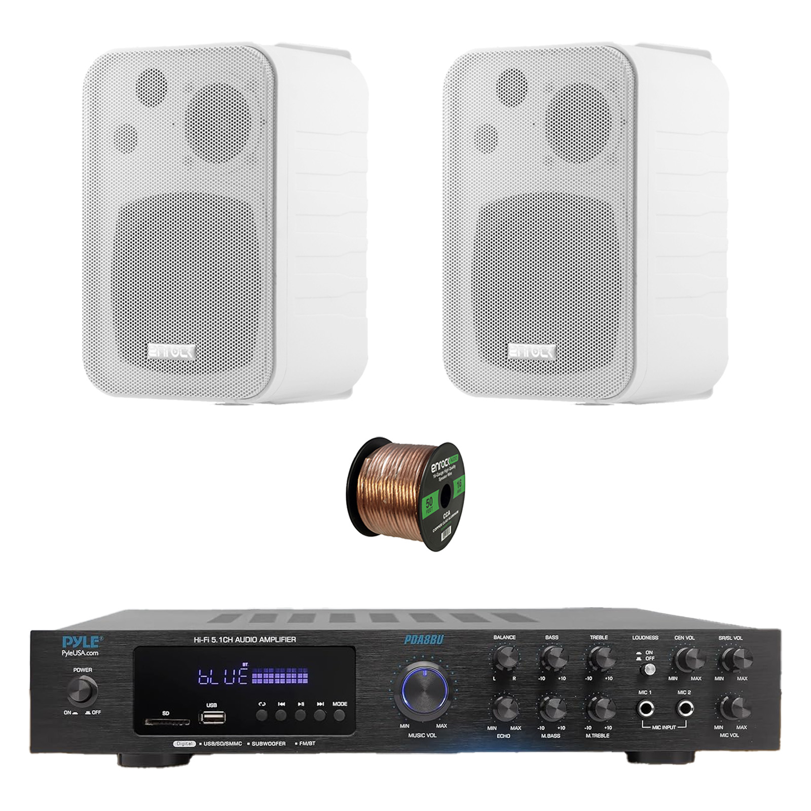 • PACKAGE BUNDLE INCLUDES: Pyle PDA8BU 5.1 Channel Home Audio Theater Bluetooth MP3/USB/SD/AUX/FM Radio Receiver, 2x 4" 30 Watt Peak 3-Way Water-Resistant Indoor/Outdoor Audio Speakers (White), 50 ft 16 Gauge Speaker Wire