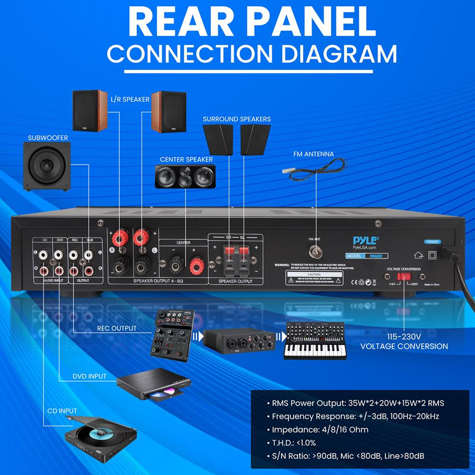 • RECEIVER: Pyle PDA8BU 5.1 Channel Amplifier System features a VFD screen display with Frequency level light, Built-in Bluetooth for Wireless Audio Streaming - Auto Scan, Memory, Radio Station PREVIOUS/NEXT Control - MP3 Digital Audio File Playback
