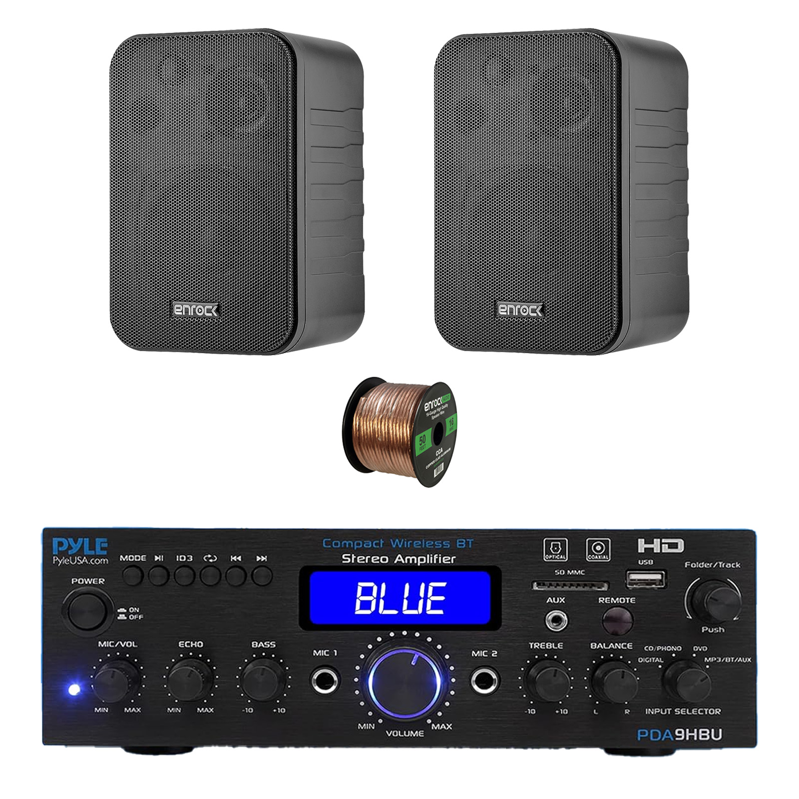Pyle PDA9HBU 2-Channel Home Theater Bluetooth HiFI Audio Optical/HDMI/USB/SD FM Radio Receiver, 2x 4" 30 Watt 3-Way Water-Resistant Indoor/Outdoor Audio Speakers (Black), 50 ft 16 Gauge Speaker Wire