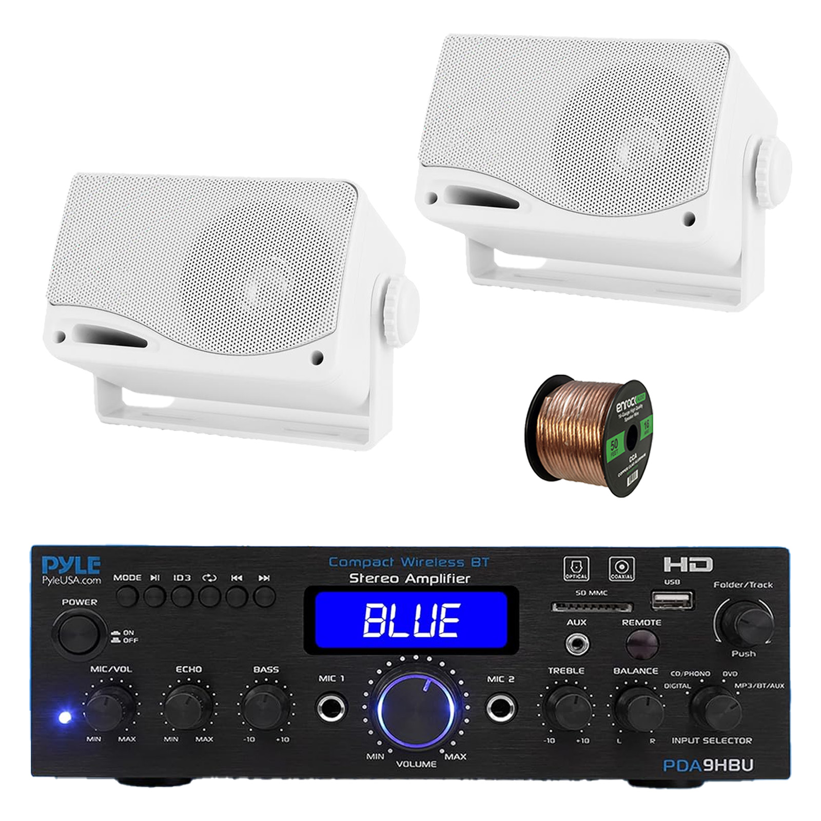 Pyle PDA9HBU 2-Channel Home Theater Bluetooth HiFI Audio Optical/HDMI/USB/SD FM Radio Receiver, 2x 3.5" 200 Watt 3-Way Indoor/Outdoor Wall Mount Audio Speakers (White), 50 ft 16 Gauge Speaker Wire