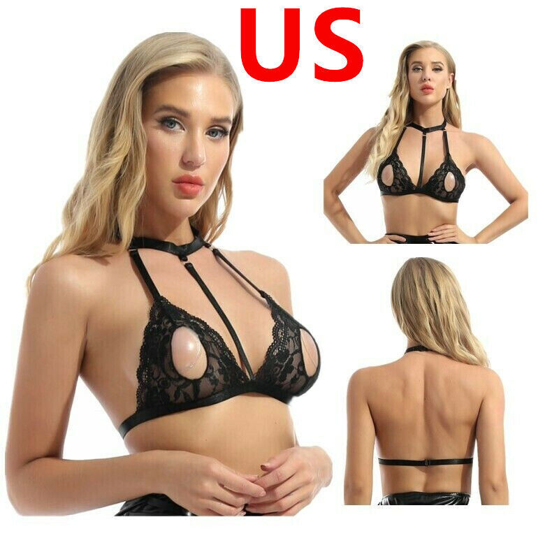 Women See-through Lace Unlined Wireless Bra Tops Halter Neck Strappy Hollow Out Lingerie Brassiere.