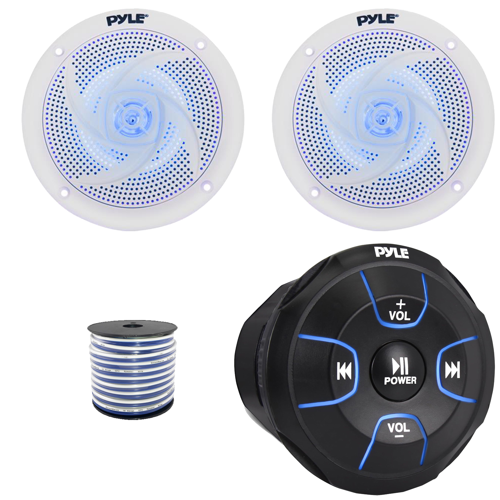 PACKAGE BUNDLE INCLUDES: Pyle PLMRBT18 Bluetooth Audio Amplified Marine Waterproof Controller, 2x Pyle PLMRS43WL 4" 100W Max Power 2-Way Low Profile Blue Flashing LED Boat Audio White Speakers, 50 Feet 18 Gauge Speaker Wire