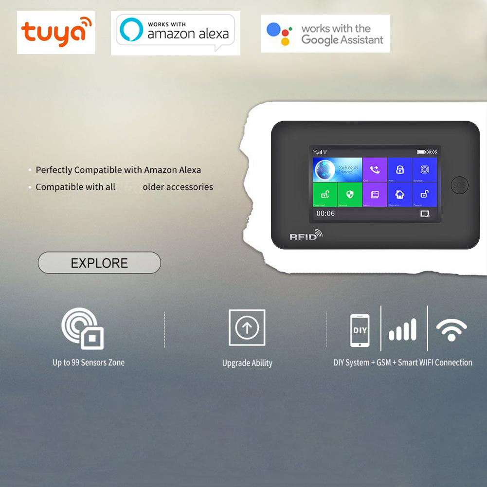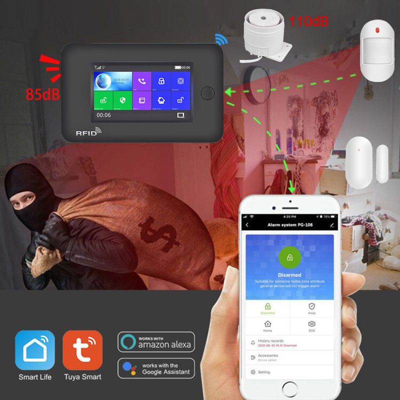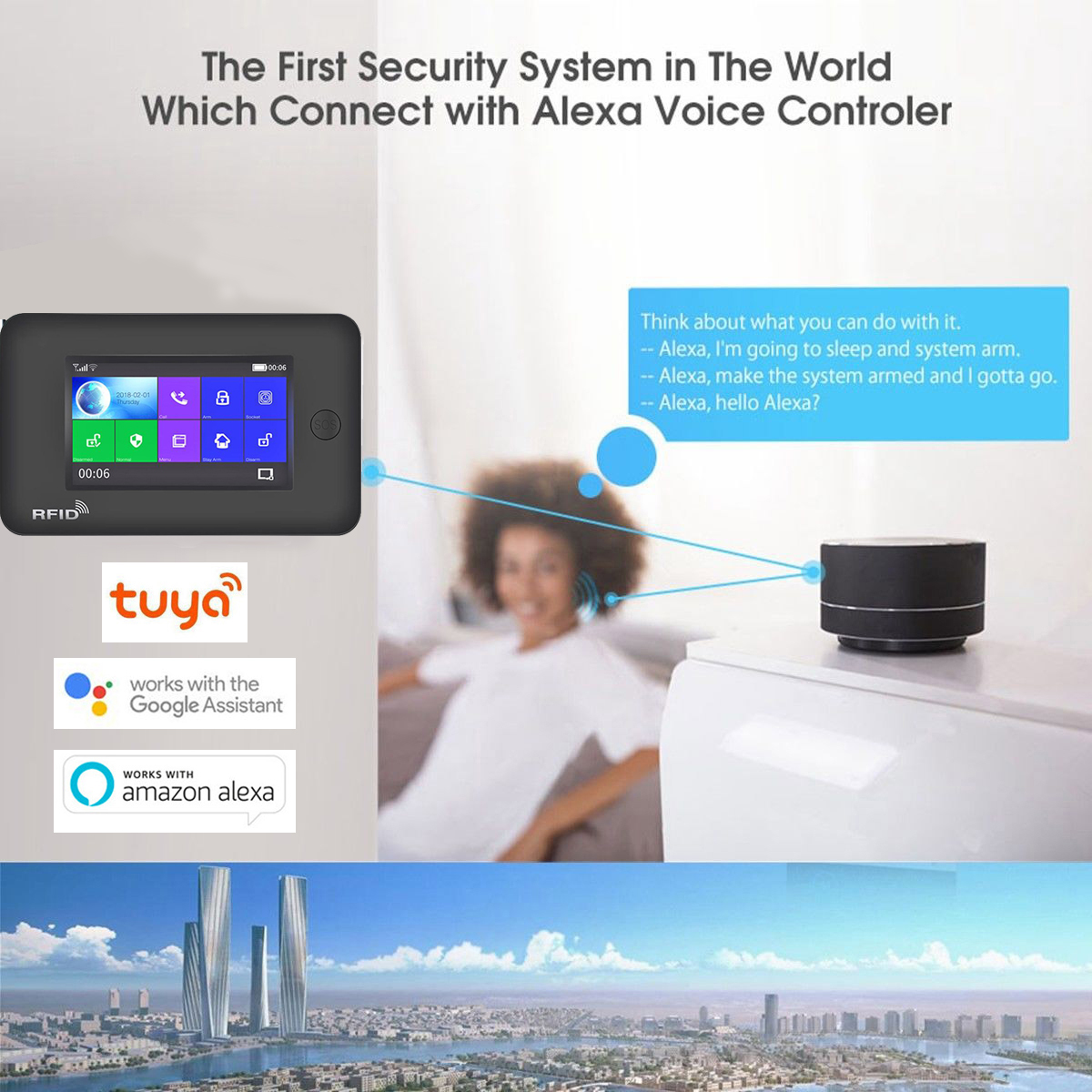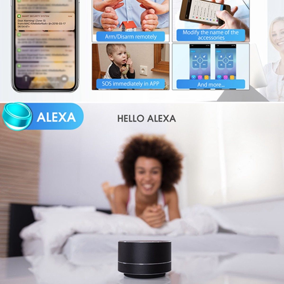 A: Compatible with Alexa and Google home: This alarm sysetm works with Amazon Alexa and Google Home for voice control ( Alexa and google home devices not included ). Just ask app Alexa on your phone to Arm / Disarm/ the whole system in a specific instruction like "Alexa, please arm the alarm system". Remote control your Alarm system anywhere in the world with your smart cell phone, no need repeated operation!