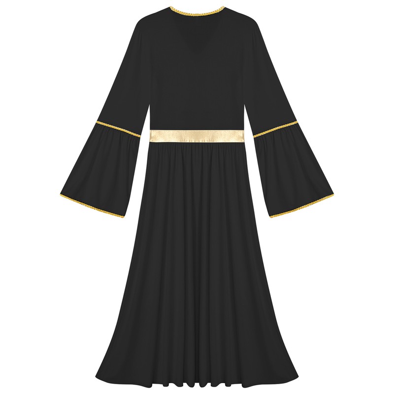 Designed with long sleeve with bell bottom, gold trim around neck and cuff and gold patchwork at waist.