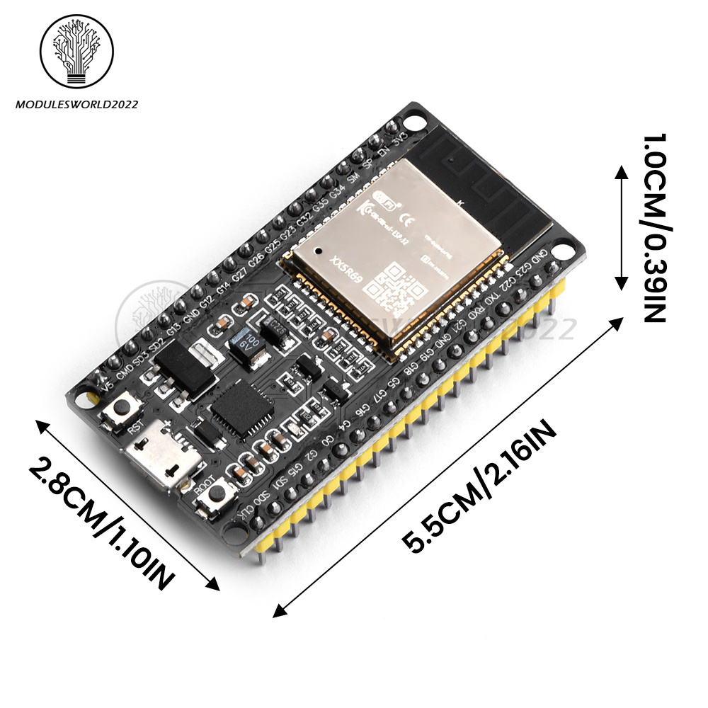 The core of this module is the ESP32-D0WDQ6 chip, which is scalable and adaptive. The two CPU cores can be individually controlled or powered up. The clock frequency can be adjusted from 80 MHz to 240 MHz, and the user can power off the CPUs and use the low-power co-processor to constantly monitor the status of peripherals or whether certain analog quantities exceed the threshold. SPI, UART, I2S and I2C.