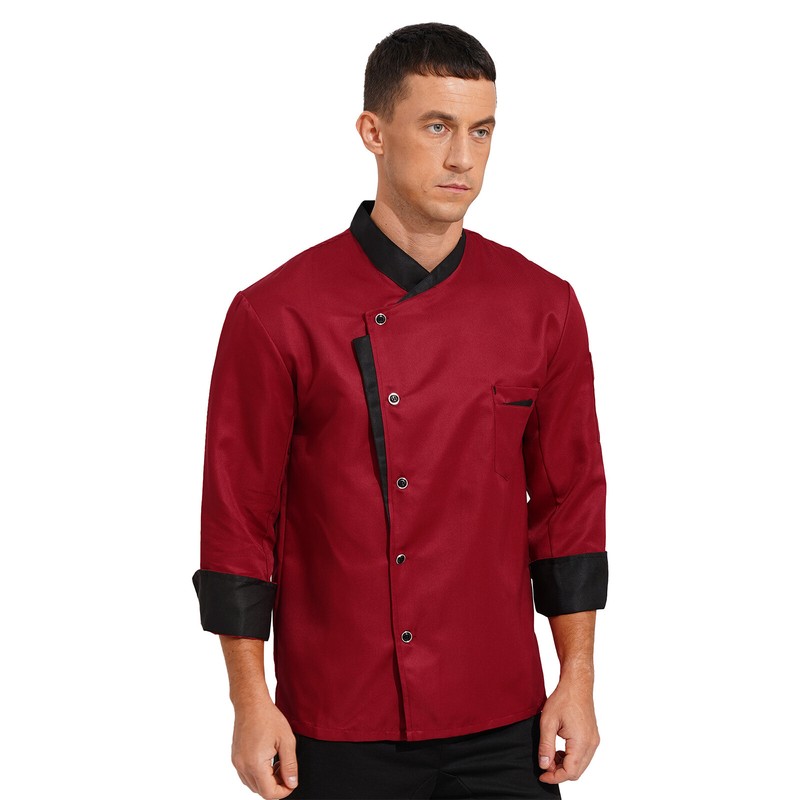Long sleeve chef jacket for men or women, contrast color details, button closure.