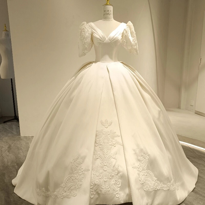 Puff Sleeves Wedding Dresses Victorian V Neck Satin A Line Elegant Bridal Gowns
