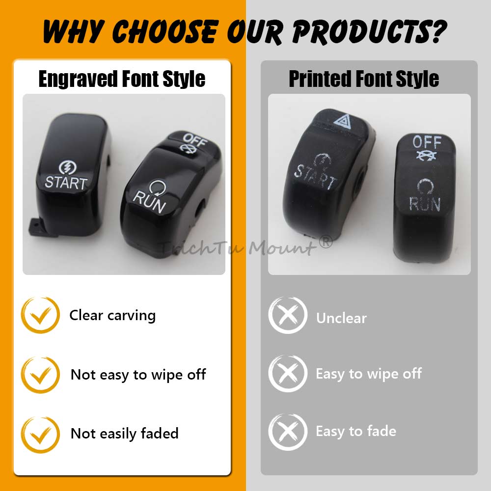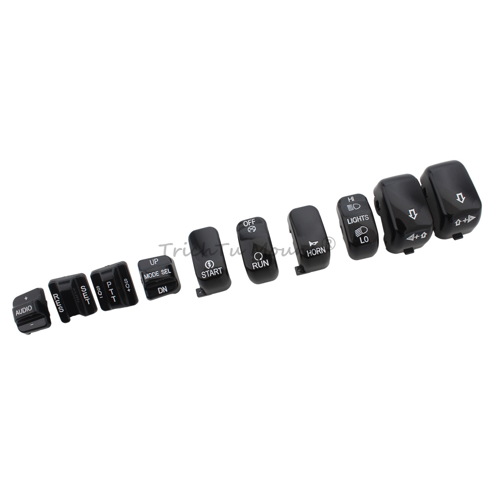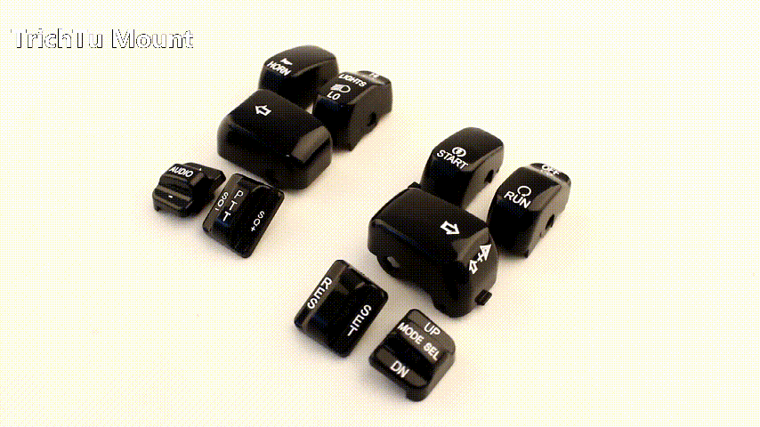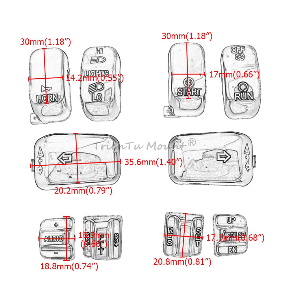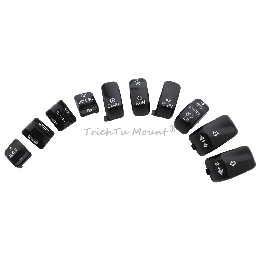 Description: Caps are a direct replacment for the standard equipment black switch caps Replace the stock black caps without re-wiring Shaped for the same ergonomic feel as the Original Equipment hand control switches Black switch caps complement other chrome hand control accessories (Chrome/black Master Cylinder Kit, Chrome/black Hand Levers, Chrome/black Switch Housings and Chrome/black Master Cylinder Cover) Specification: Condition: 100% Brand New Material: High Quality ABS Plastic Color: Black Placement on Vehicle: Left and Right Package included: 1 set of Hand Switch Cap Fitment: Fits For Harley '96-'13 FLHTCU, FLHTK, FLTR and FLTRU and '09-'13 FLHTCUTG models. For Harley CVO Electra Glide FLHTCSE 2004 For Harley CVO Electra Glide FLHTCSE2 2005 For Harley CVO Road Glide 2 FLTRSEI2 2001 For Harley CVO Road Glide EFI FLTRSEI 2000 For Harley CVO Road Glide FLTRSE3 2009 For Harley CVO Ultra Classic Electra Glide FLHTCUSE 2006 For Harley CVO Ultra Classic Electra Glide FLHTCUSE2 2007 For Harley CVO Ultra Classic Electra Glide FLHTCUSE3 2008 For Harley CVO Ultra Classic Electra Glide FLHTCUSE4 2009 For Harley CVO Ultra Classic FLHTCUSE5 2010 For Harley Electra Glide Ultra Limited FLHTK 2010-2013 For Harley Road Glide EFI FLTRI 1998-2006 For Harley Road Glide FLTR 1998-2002,2007-2009 For Harley Road Glide Ultra FLTRU 2011-2013 For Harley Street Glide Trike FLHXXX 2010-2011 For Harley Tri Glide Ultra Classic FLHTCUTG 2009-2013 For Harley Ultra Classic Electra Glide EFI FLHTCUI 1996-2006 For Harley Ultra Classic Electra Glide FLHTCU 1996-2013