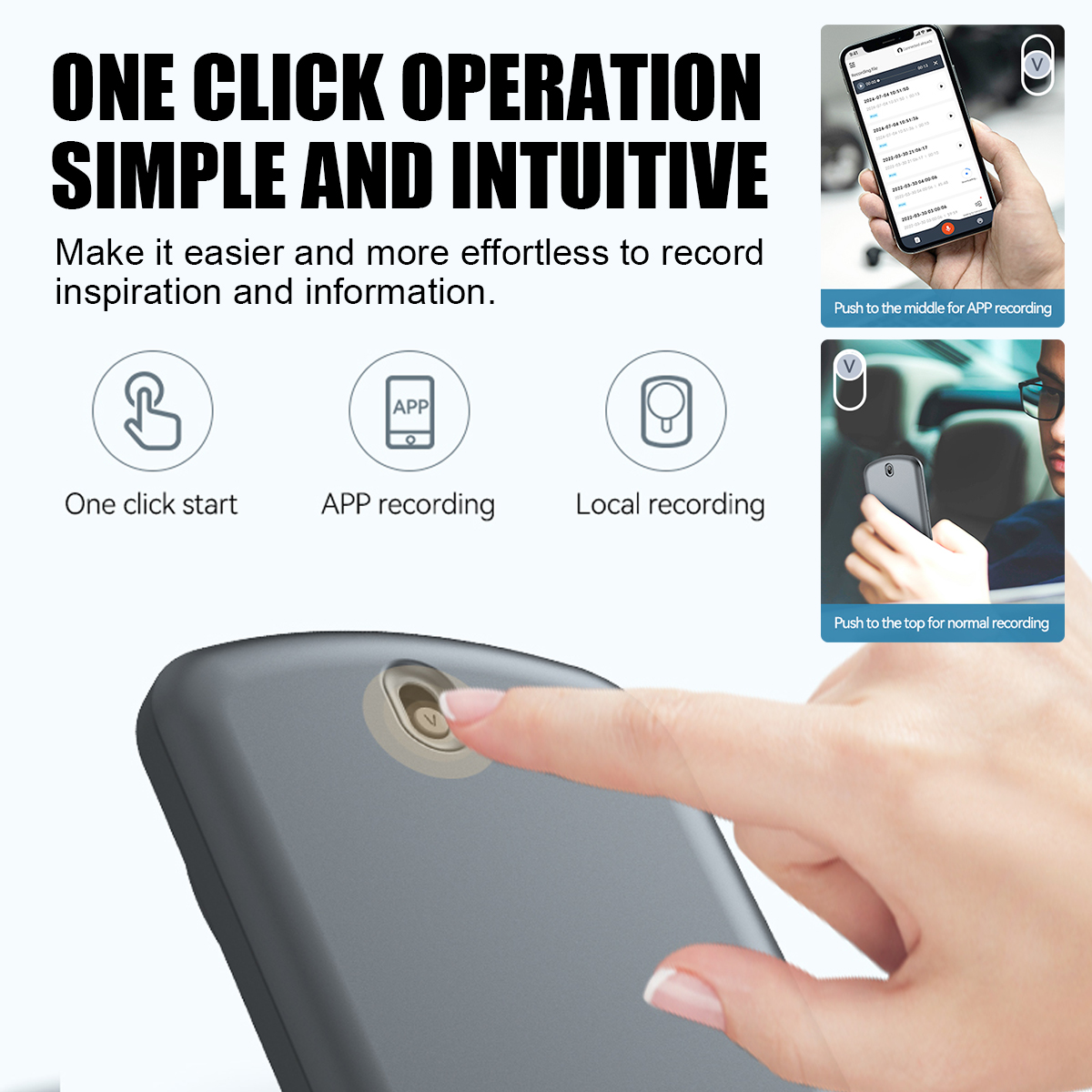 3. Easy Shuttle,Simple and intuitive:Make it easier and more effortless to record inspiration and information. Pushing the button to the middle for APP control recording, Push the button to the top to enable normal recording and call recording on the device