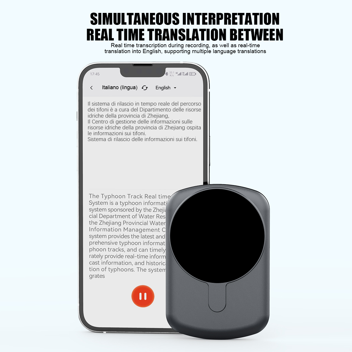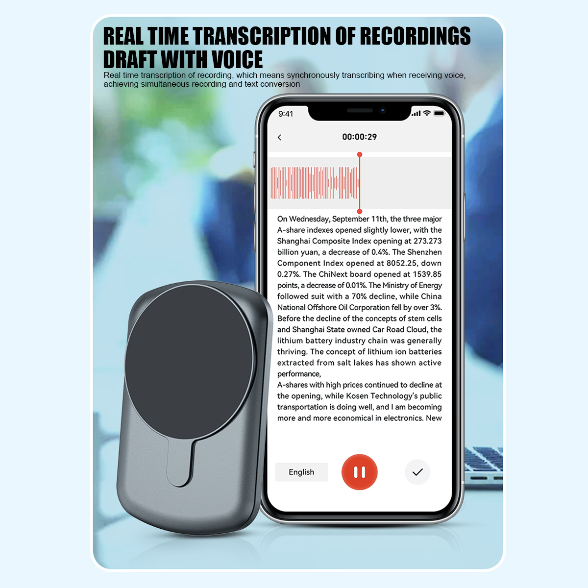 8. Simultaneous interpretation Real time translation between Chinese and English: Real time transcription during recording, as well as real-time, translation into English,supporting multiple language translations.