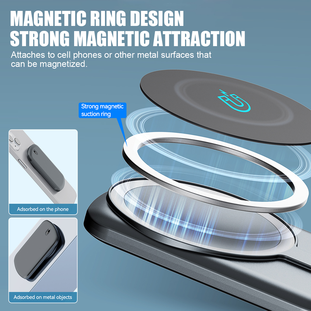 5. Magnetic suction ring design .Strong magnetic adsorption:Adsorbed on mobile phones or other metal surfaces that can be adsorbed
