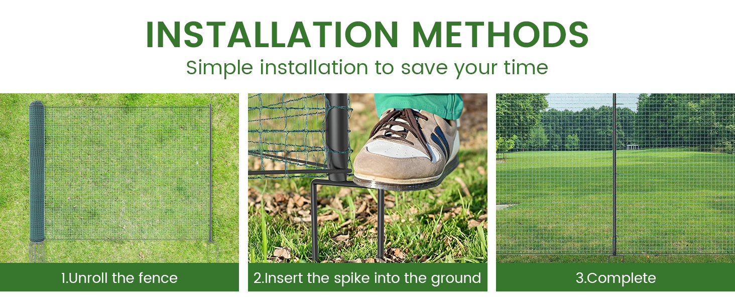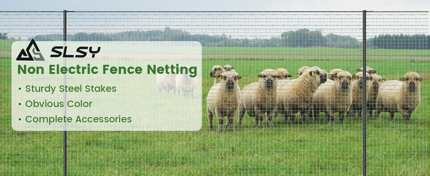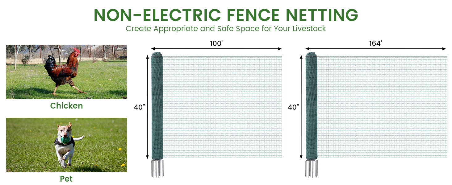 Safe and Reliable Space for Your Animals: Our Non-Electric Fence keeps your chickens, dogs, other animals, and gardens safe. It can be used as a boundary fence to protect them from unwanted animals and predators Sturdy Material: Experience unrivaled durability and support with our Non Electric Fence netting. Our 40"x 100' Size type meticulously designed netting features 15 fiberglass posts, Our 40"x 164' Size type meticulously designed netting features 25 fiberglass posts, boasting heavy-duty double-spiked stakes. This combination ensures rigid support, capable of withstanding the toughest conditions Portability and Convenience: Non Electric fence netting is lightweight and portable, making it convenient to move or reconfigure as needed. Whether you're temporarily enclosing a new grazing area or protecting crops during different growth stages, the netting can be easily relocated without leaving a permanent structure Easy Setup: Designed with convenience in mind, the netting is lightweight and simple to install, allowing you to quickly create custom-sized enclosures as needed What's in the Package: Roll of 40"x 100' non-electric netting with 15x built-in double-spiked posts, 100 zip ties and 1 roll twist tie Or Roll of 40"x 164' non-electric netting with 25x built-in double-spiked posts, 200 zip ties and 1 roll twist tie For easy and safe installation. Posts are sturdy and durable, which can enhance the appearance and stability of the fence