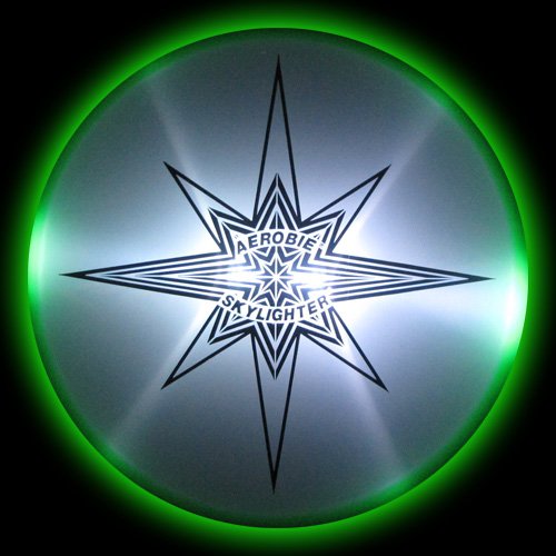 Keep the fun going into the night with the Aerobie Skylighter Disc! The superbright lights inside this light-up flying disc create brilliantly illuminated flights, adding to the fun. The Skylighter includes a spoiler rim for more accurate flights, a cushioned edge for excellent grip and a soft catch, a wide 12-inch diameter for greater stability, a sonically welded lighting module.