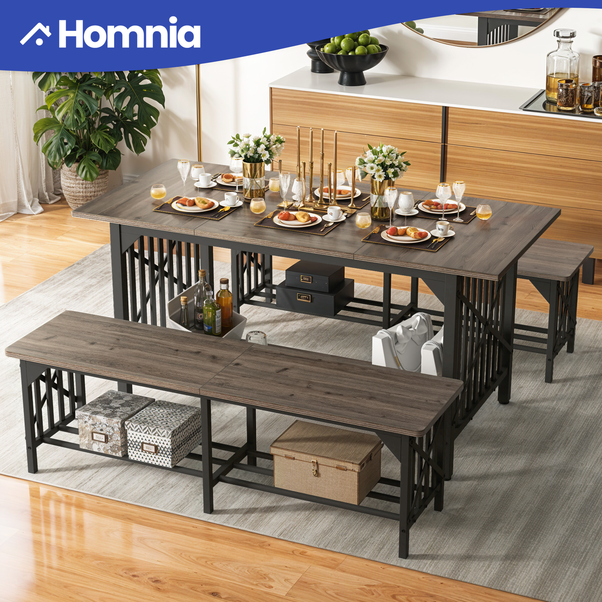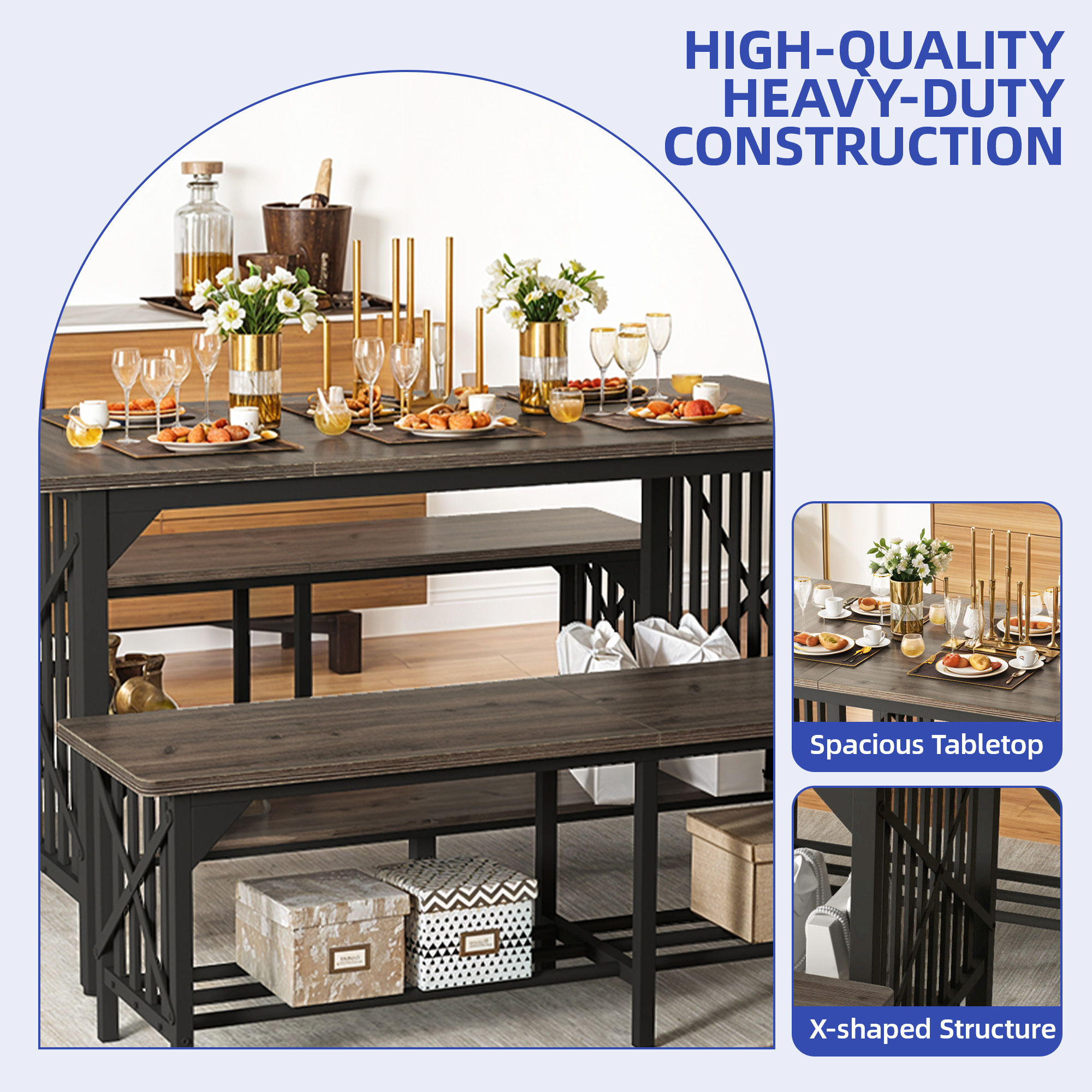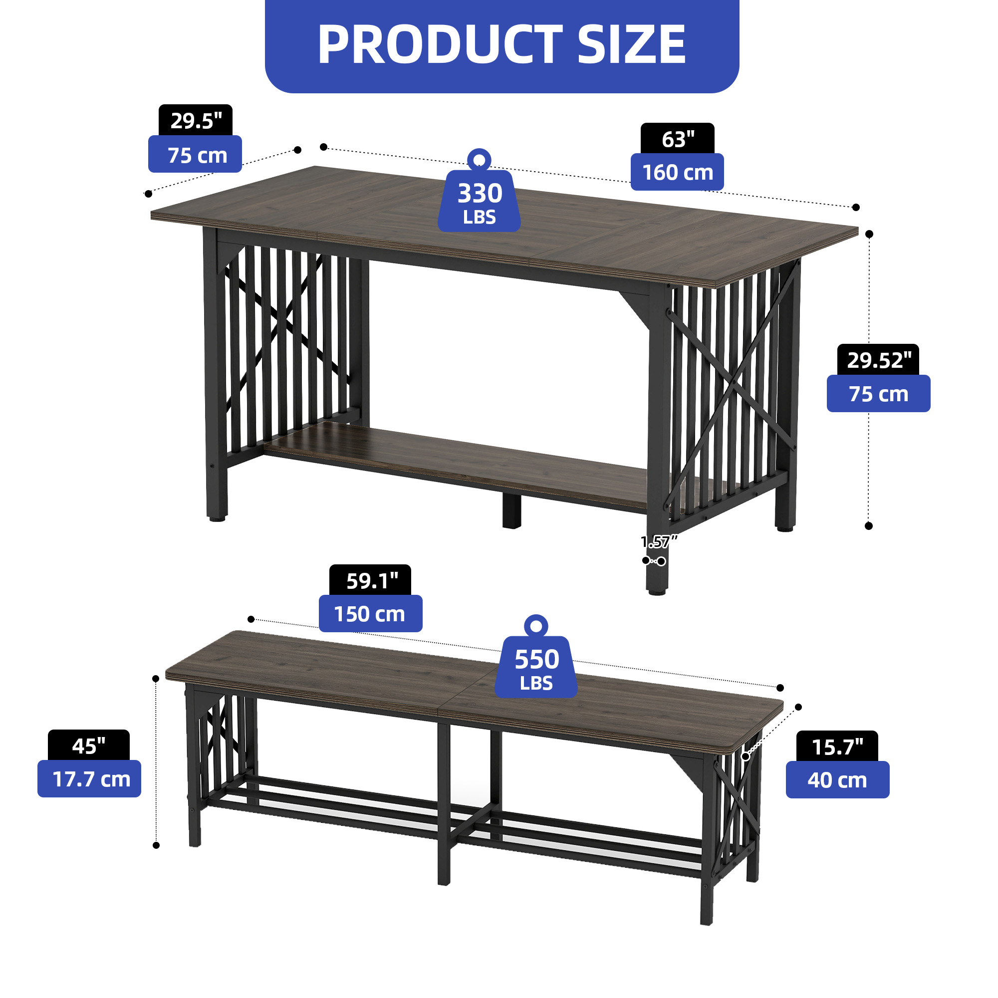 Upgrade your dining experience with our spacious 63”L x 29.5”W x 29.5”H table, perfect for family meals, meetings, and casual gatherings. Accompanied by two sturdy benches (59”L x 15.7”W x 17.7”H), this set comfortably seats up to six people. Crafted for durability, the table supports up to 330 lbs, while each bench holds an impressive 550 lbs—perfect for everyday use. Whether you’re hosting guests or enjoying daily meals, this heavy-duty dining set offers lasting reliability.