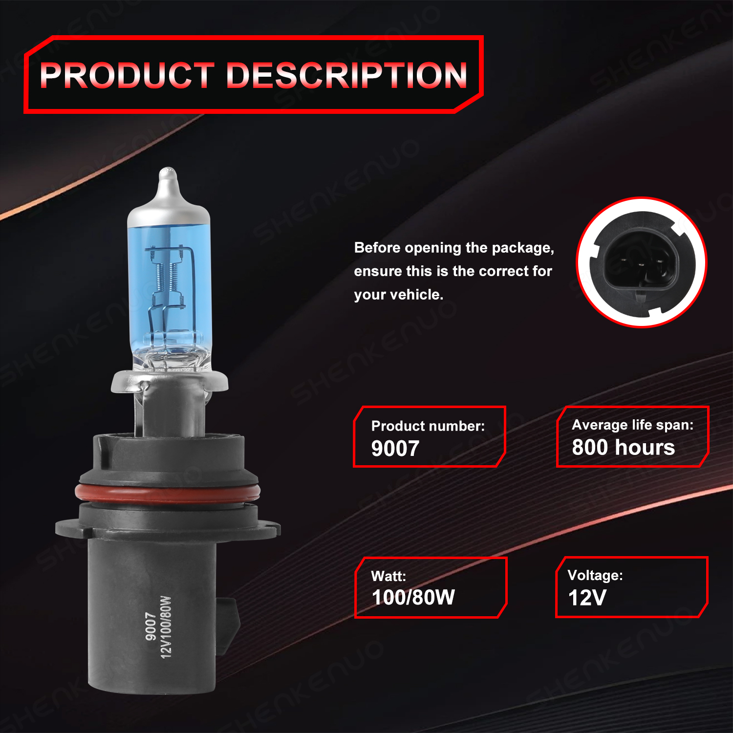 Warm Tip: Specifications: • Bulb Socket: 9007 HB5 • Color Temperature: 4200K • Color Light : Warm White • Wattage: 100/80 W • Voltage(V): DC 12V • Working temperature: -40℃~+80℃ • Beam Angle: 360° • Waterproof Level: IP65 • Material: Aviation Aluminium • Super Long Service Life: ≥800 Hours • Warranty:1 Year • Canbus Error Free: No. For most vehicles, just directly plug and play. Yet for some vehicles with CAN-BUS system, it may require install decoder or load resistor to avoid hyper flash or fast blinking. • Please Note: Please check your car manual or original bulb to confirm the bulb size, length is correct or not before purchasing to save your time. Package Included: 2Pcs Halogen Bulbs (Random shipment of new and old packaging) Advantage: Energy saving, environmental protection, Stable performance, through strict test, Use safer driving in the car For most cars, just Plug-n-Play,no ballast required. Yet for some European vehicles or new vehicles, load resistors maybe required to avoid the error code or blinking. When installing this bulb, please make sure to turn the car off, and key out. bulbs are very easy to install. You just have to plug it in the socket. ( bulb has + AND -terminal. If it doesn't light up after inserting into the socket, all you need to do is insert it oppositely.) The compatible vehicle list shows only partial cars due to the ebay limits, if your car plug is same with this bulb, the item will fit your car. If you're not sure about it, please send us an ebay message and tell us your car year, make, model and the position you need to replace, we will help you check with it. If you have a decoding problem or any other problems, please contact us first, we will help you with it. I'm a new seller, thanks a lot for your trust and convince! I will serve you with all my heart. |