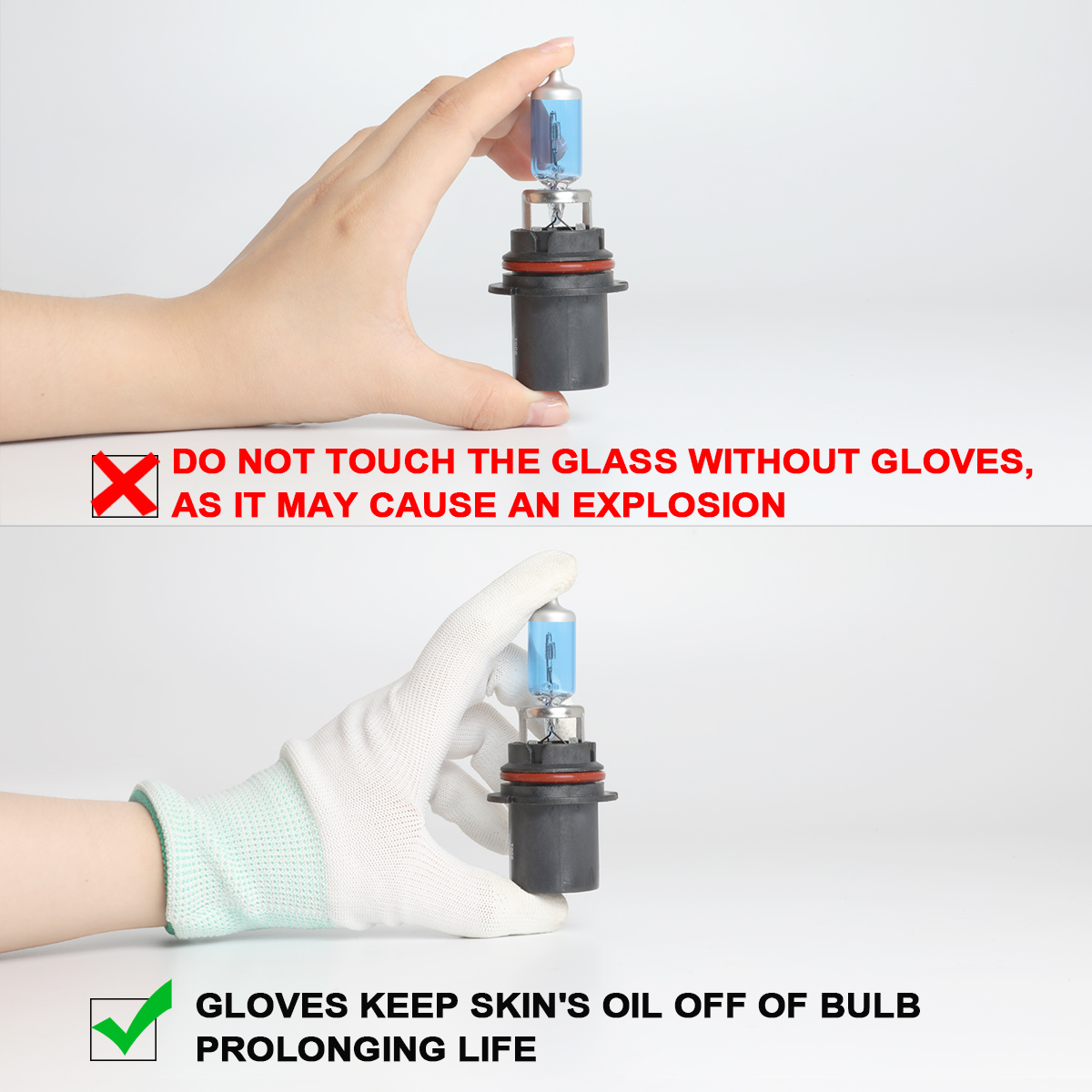 Please wear gloves when installing the halogen bulb and do not touch the glass surface of the halogen lamp directly with your hands! Moisture from your hands that is transferred to the bulbs will reduce the life span and quality of the output of the bulbs.