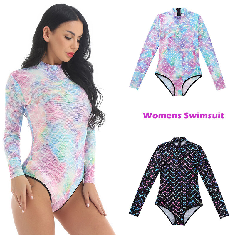 DE ranrann Damen Badeanzug Bademode Fisch Schuppen Print Langarm Body Tops Sexy