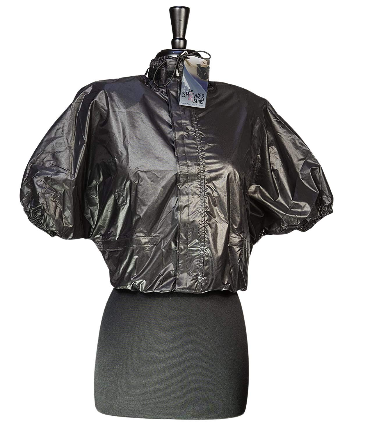 - MADE FROM WATER-RESISTANT MATERIAL THAT WILL LAST. In contrast to trash bags or other uncomfortable and cheap plastic protection, the Shower Shirt is made of high-quality woven polyester that is comfortable on your skin and durable. It is also machine washable, which makes it ideal for repeat use in many showers.