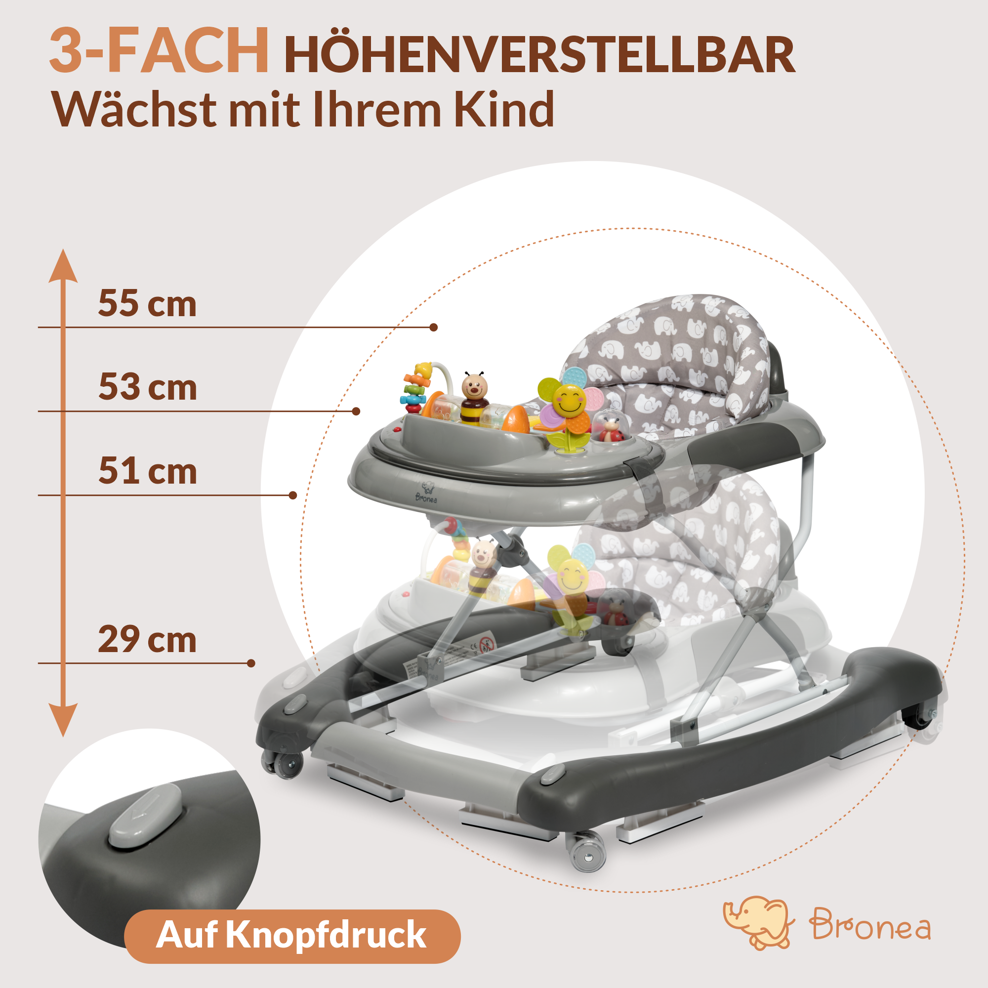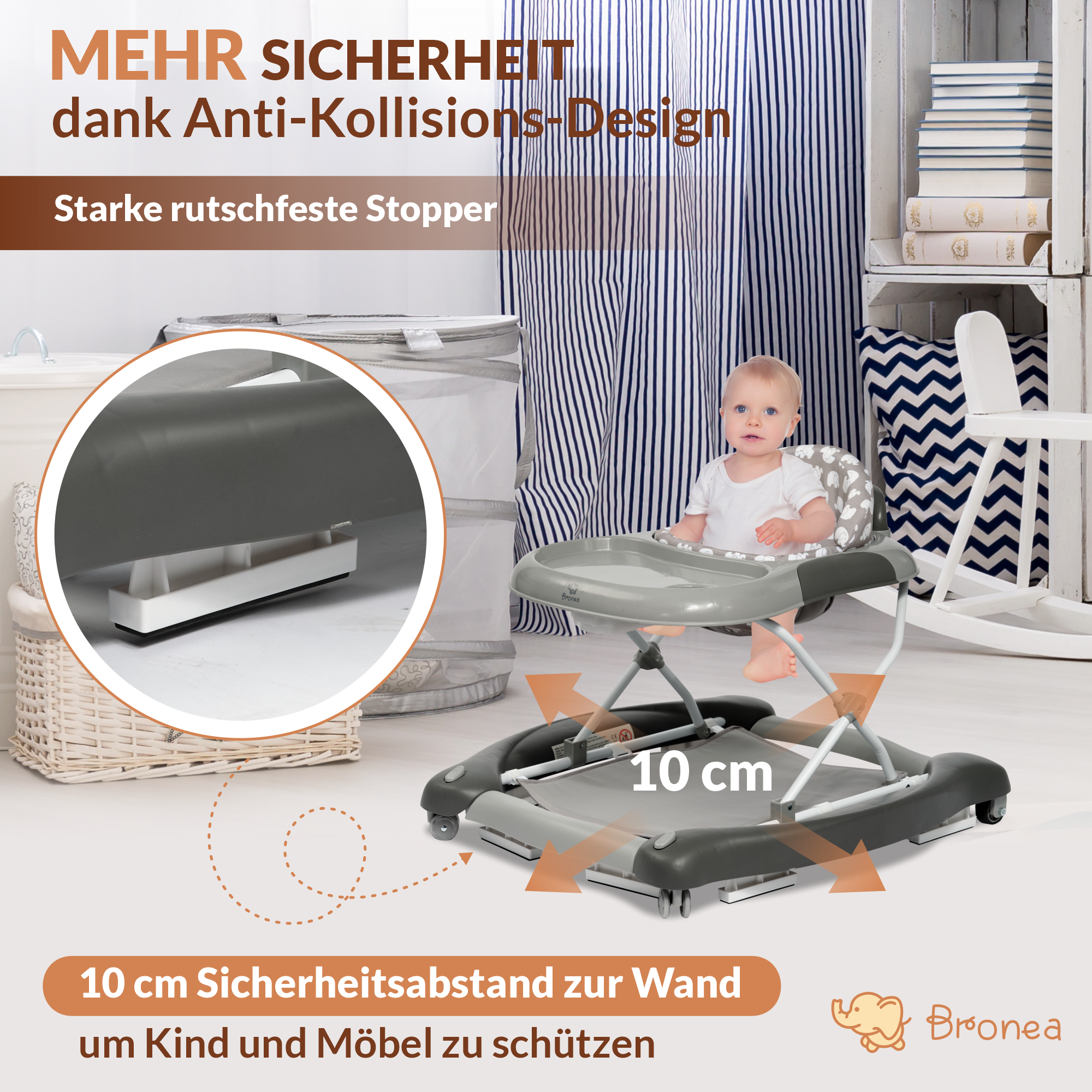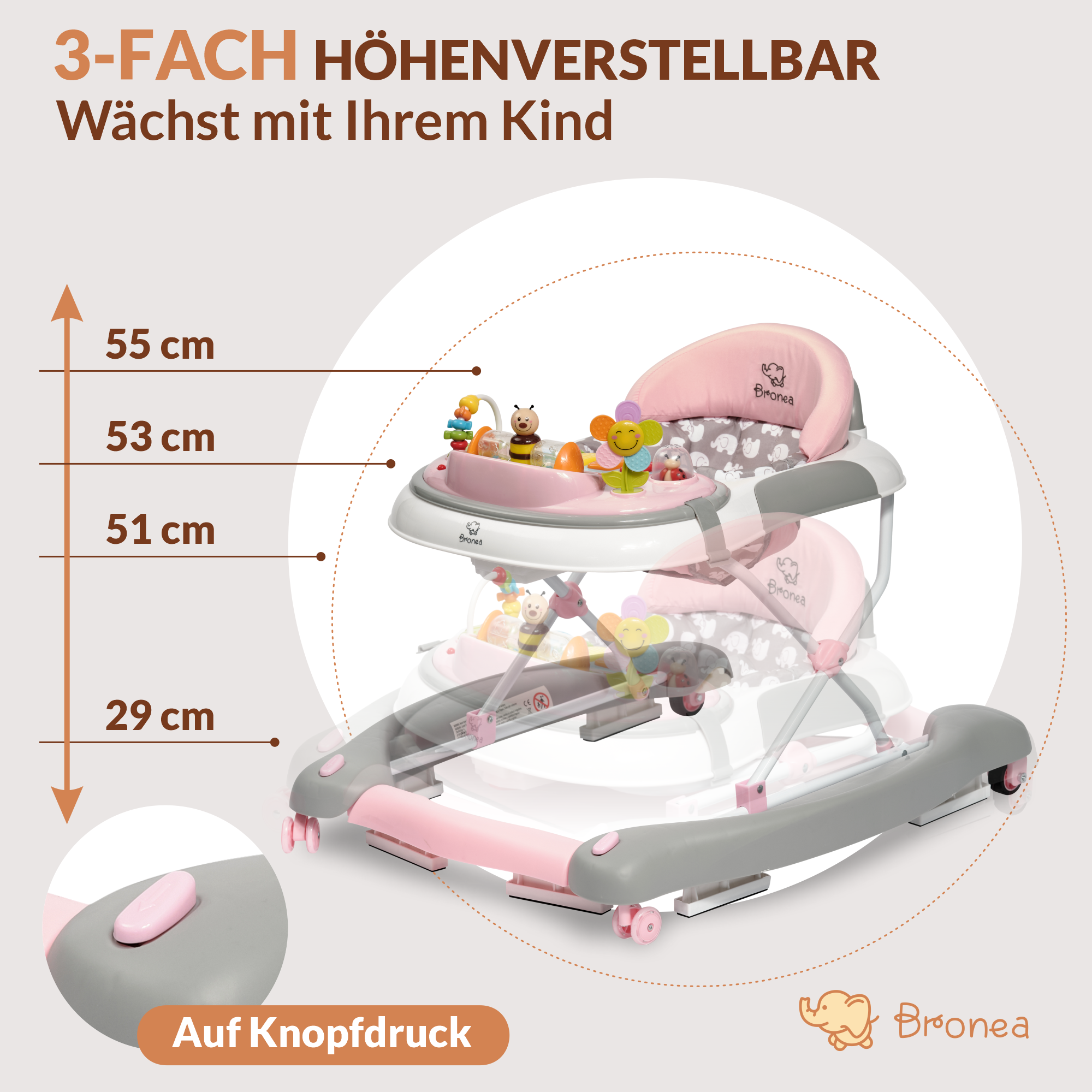 Unser Baby Gehfrei hat gummierte, leise und bodenschonende Reifen für alle Bodenbeläge. Du kannst auch den Widerstand einstellen, um die Beinmuskulatur und motorischen Fähigkeiten deines Babys zu trainieren.