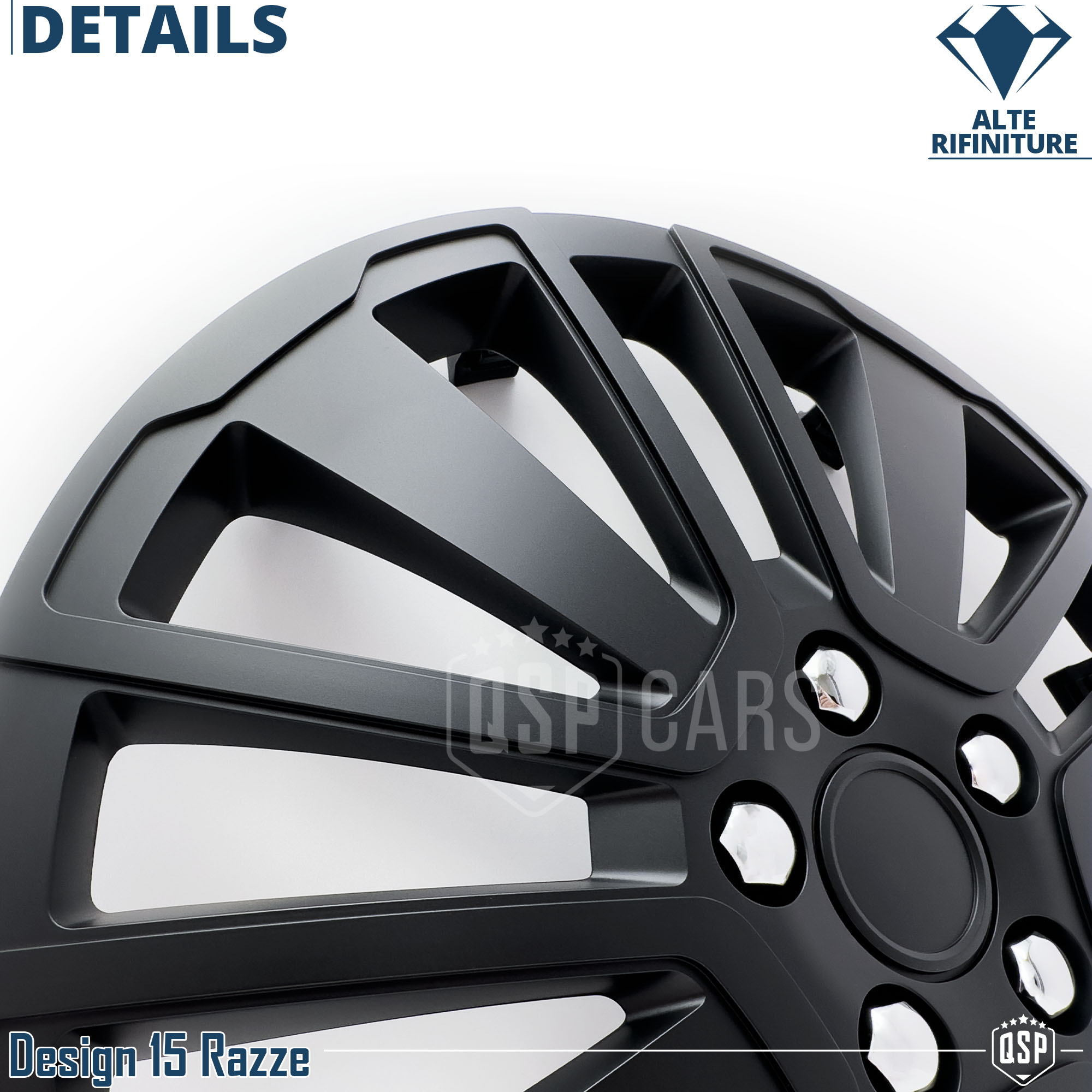 Design a 15 Razze, Neri, sono Ispirati ai Cerchi in Lega Sportivi dei più importanti Brand Automobilistici; di qualità Eccellente nella scelta dei materiali, Rifiniture del Dettaglio, tatto, e colorazione.