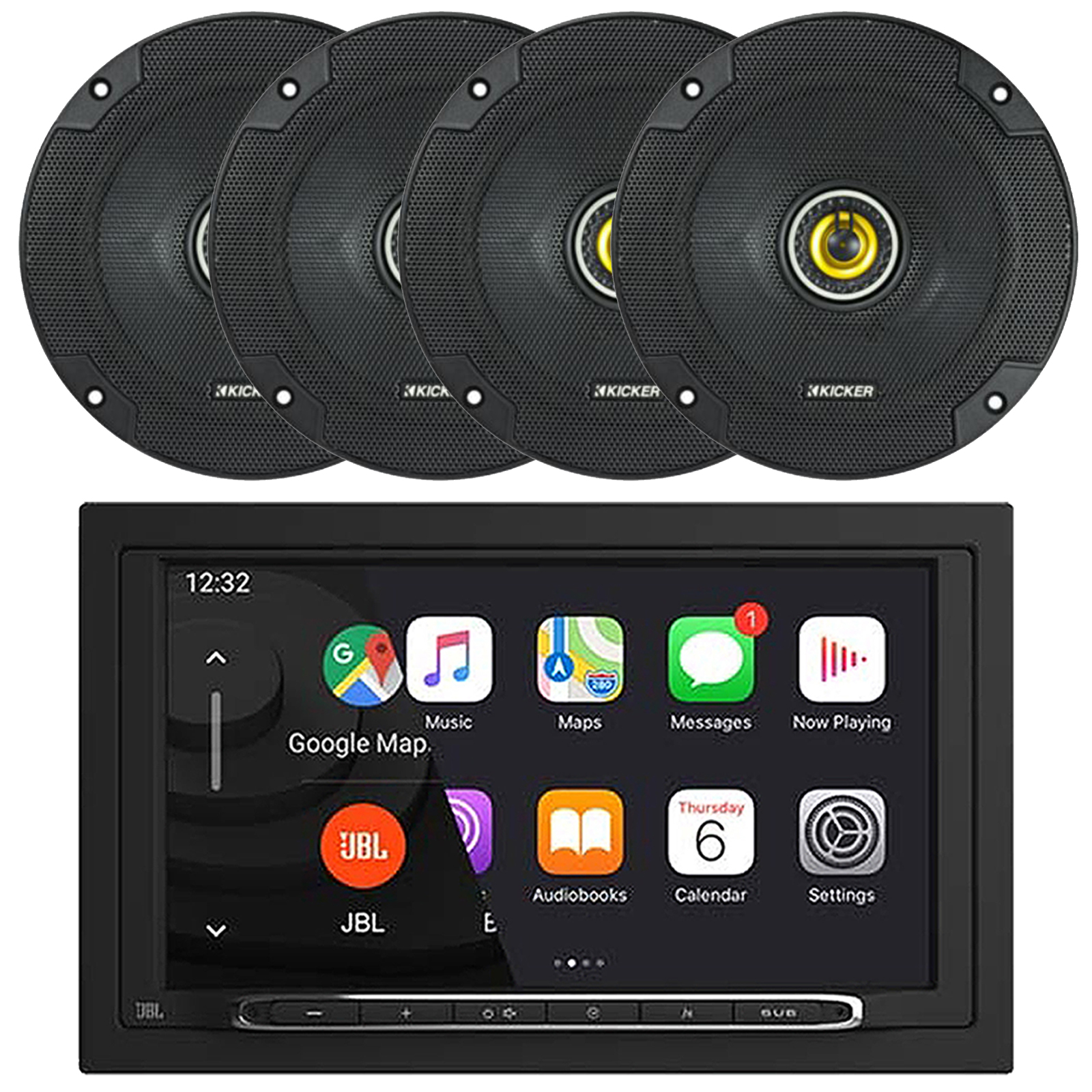 PACKAGE BUNDLE INCLUDES: JBL Legend 700 7” Touchscreen Display Double-DIN Mechless Bluetooth AM/FM Receiver W/Wireless Apple CarPlay & Android Auto, 4x Kicker CSC65 CS Series 6.5" 300 Watts Max Power 2-Way Car Audio Coaxial Speakers