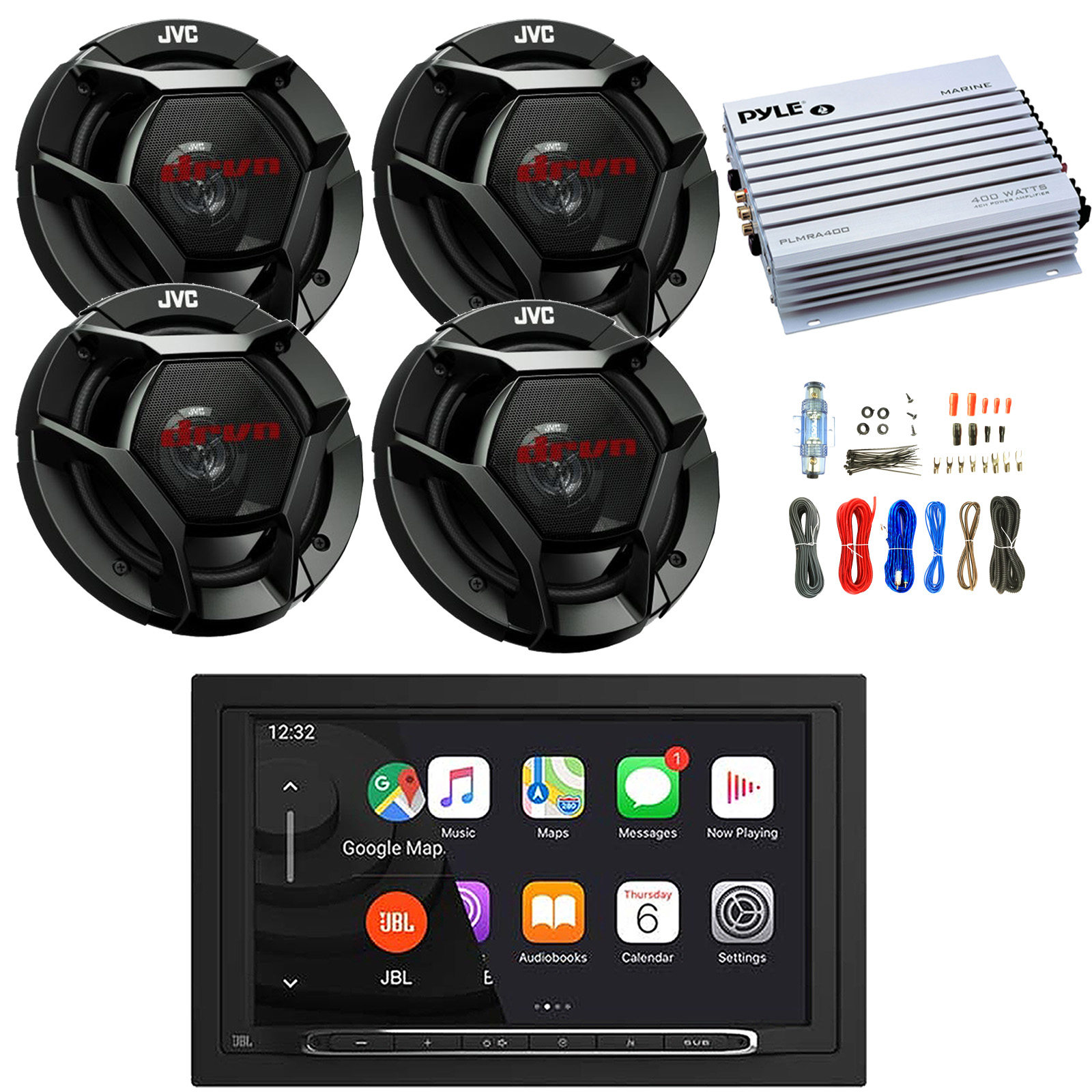 • PACKAGE BUNDLE INCLUDES: JBL Legend 700 7” Touchscreen Display Double-DIN Mechless Bluetooth AM/FM Receiver W/Wireless Apple CarPlay & Android Auto, 4x JVC CS-DR621 drvn DR Series 6.5" 300 Watts Max Power 2-Way Coaxial Car Audio Speakers, Pyle PLMRA400 Marine 4 Channel 400 Watt Amplifier W/8 Gauge Amplifier Wiring Installation Kit