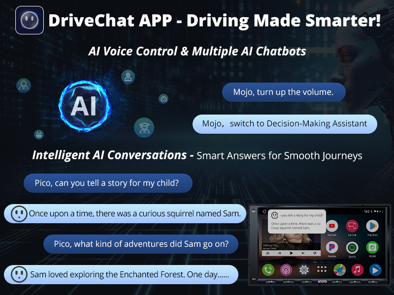 【L'app DriveChat: il vostro compagno di guida AI】Grazie al controllo vocale dell'intelligenza artificiale, è possibile utilizzare senza problemi l'autoradio integrata da 7 pollici, effettuare chiamate e gestire la riproduzione musicale, il tutto senza togliere le mani dal volante o gli occhi dalla strada. Sono disponibili più drivebot, che consentono di cambiare ruolo e di ricevere istruzioni specifiche a seconda delle necessità. Personalizzate ulteriormente la vostra esperienza personalizzando le parole di sveglia per interagire senza problemi con il vostro assistente AI.
