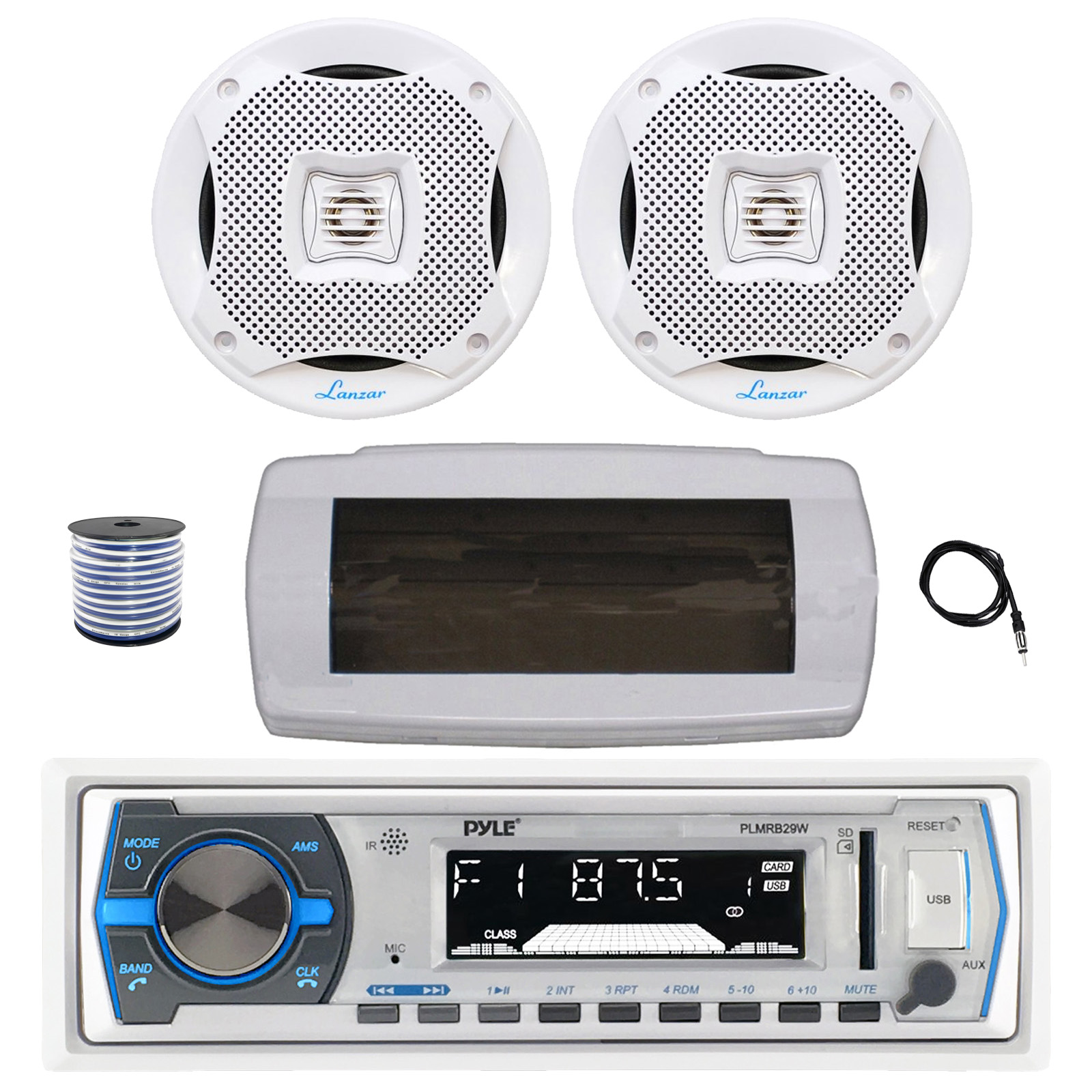 Pyle PLMRB29W Single DIN Bluetooth Marine MP3 AM/FM Stereo Receiver with White Cover, 22" Radio Antenna, Wire, 2x 6.5" 400W Max 2-Way Water Resistant Audio Speakers (White)