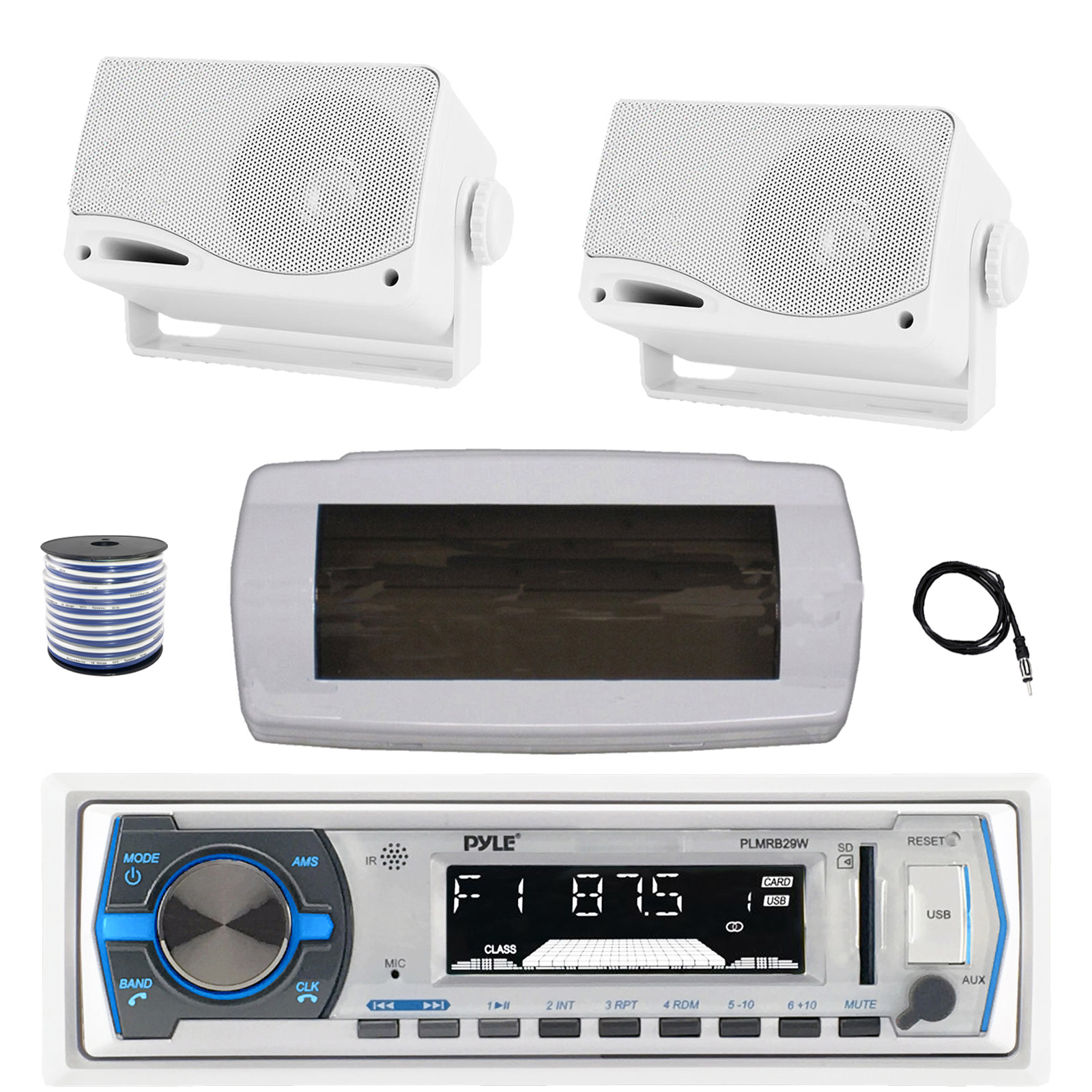 Pyle PLMRB29W Single DIN Bluetooth Marine MP3 AM/FM Stereo Receiver with White Cover, 22" Radio Antenna, Wire, 2x 3.5'' 200 Watt Max 3-Way Indoor/Outdoor Wall Mount Speaker (White)