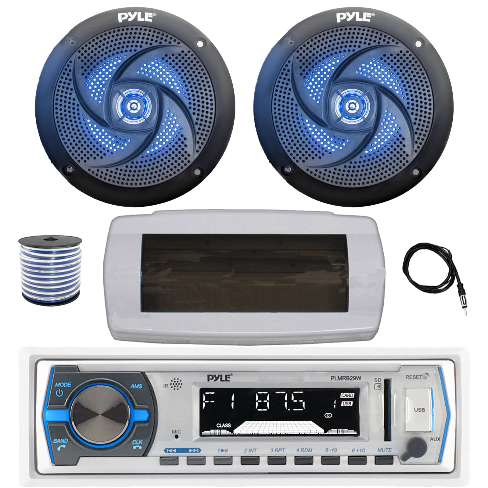 • PACKAGE BUNDLE INCLUDES: Pyle PLMRB29W Single DIN Bluetooth Marine MP3 AM/FM Stereo Receiver with White Cover, 22" Radio Antenna, Wire, 2x 5.25" 180 Watt Max 2-Way Blue Flashing LED Boat Audio Speakers (Black)