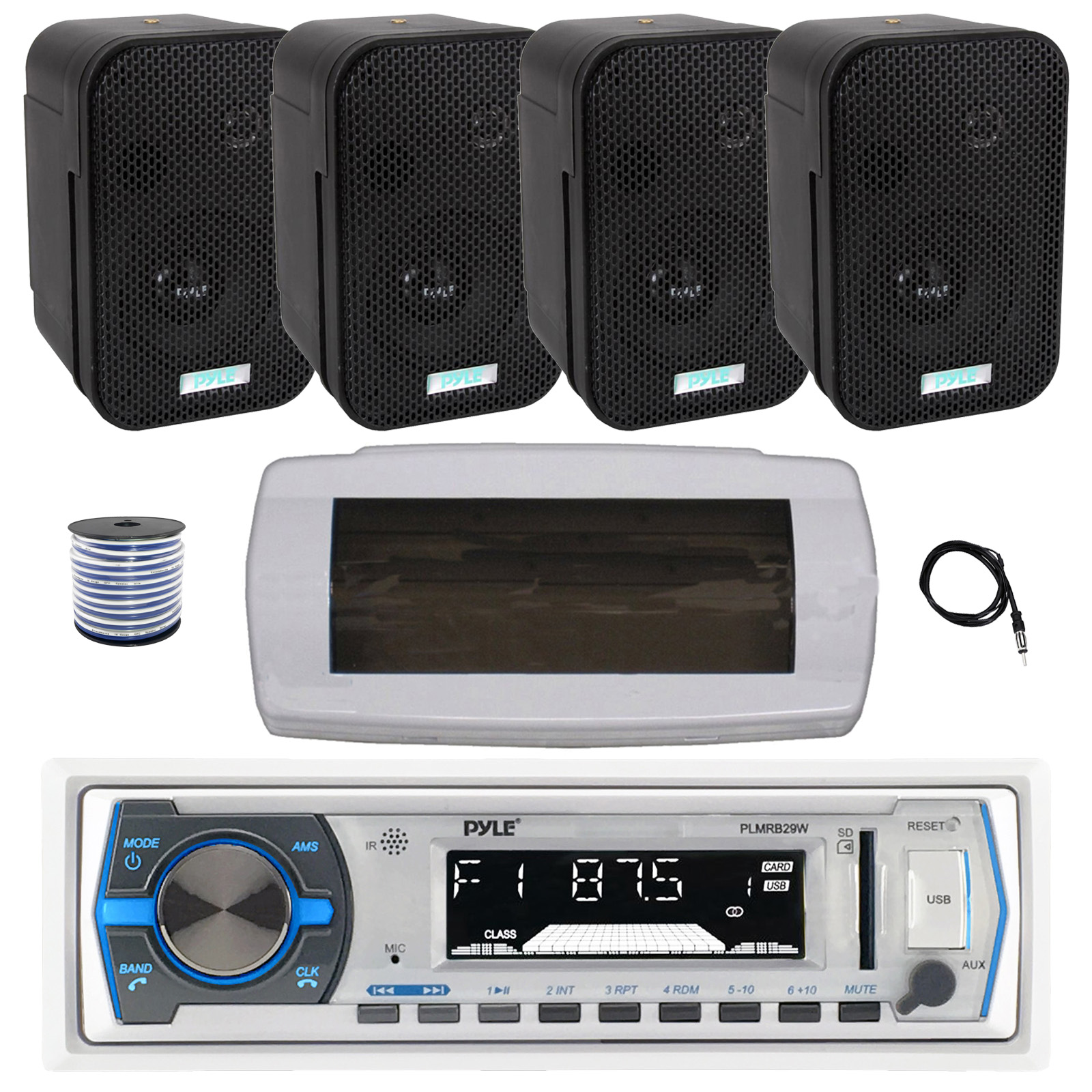 • PACKAGE BUNDLE INCLUDES: Pyle PLMRB29W Single DIN Bluetooth Marine MP3 AM/FM Stereo Receiver with White Cover, 22" Radio Antenna, Wire, 4x 3.5" 300W Max Indoor/Outdoor Waterproof Wall Mount Speakers (Black)