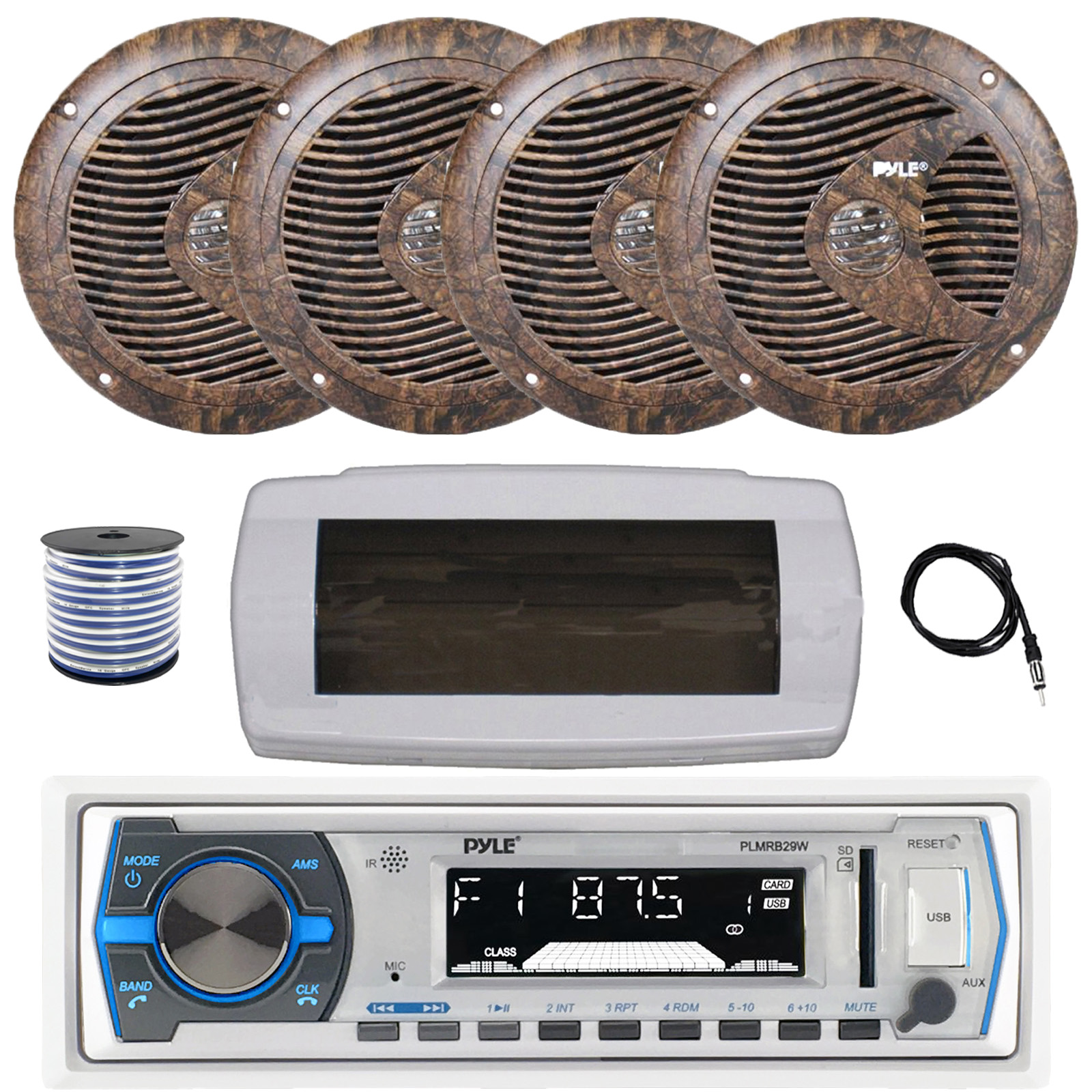 • PACKAGE BUNDLE INCLUDES: Pyle PLMRB29W Single DIN Bluetooth Marine MP3 AM/FM Stereo Receiver with White Cover, 22" Radio Antenna, Wire, 4x 6.5" 150 Watt Max Full Range Dual Cone Waterproof Stereo Speakers (Camo)