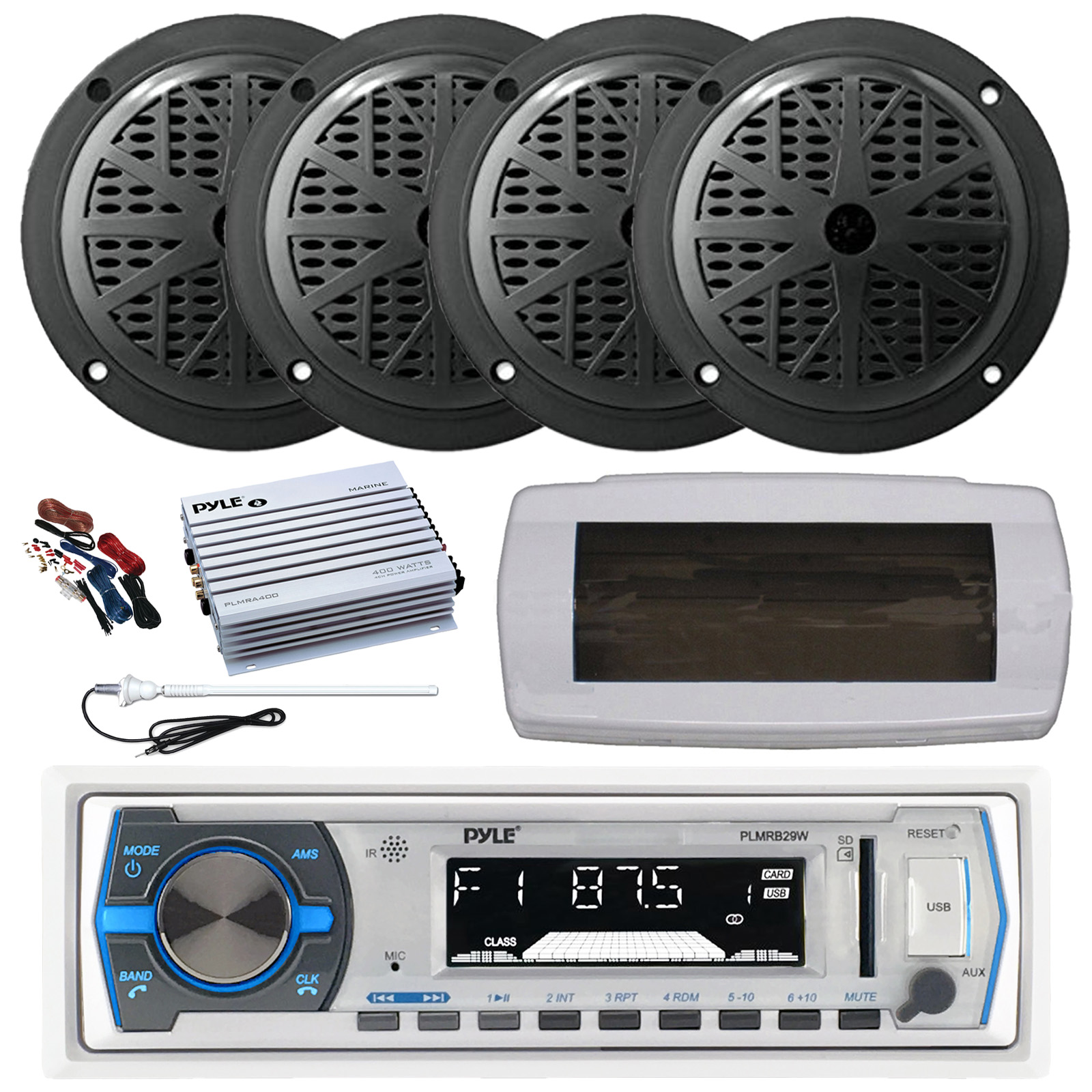 • PACKAGE BUNDLE INCLUDES: Pyle PLMRB29W Single DIN Bluetooth Marine MP3 AM/FM Stereo Receiver with White Cover, Long Range Antenna, Amplifier w/Kit, 4x 6.5" 120 Watt Max Full Range Dual Cone Waterproof Stereo Speakers (Black)