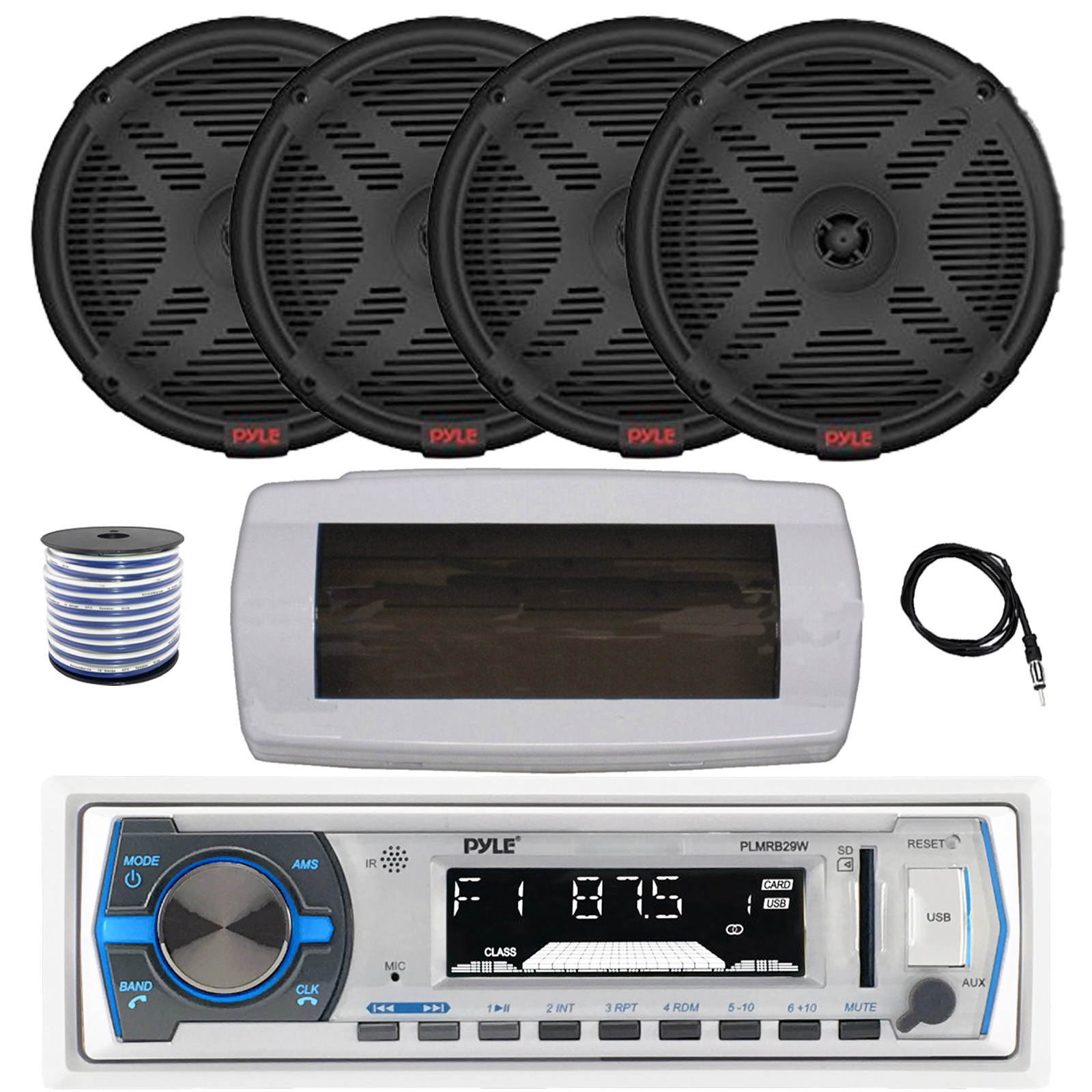 Pyle PLMRB29W Single DIN Bluetooth Marine MP3 AM/FM Stereo Receiver with White Cover, 22" Radio Antenna, Wire, 4x 6.5" 600 Watt Max 2-Way Full Range Dual Cone Waterproof Stereo Speakers (Black)
