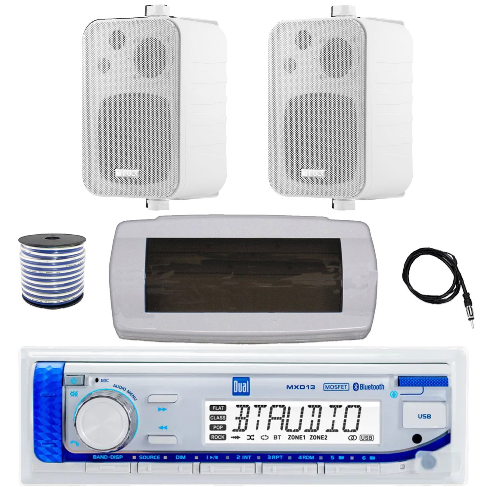 Dual MXD13 Single DIN Bluetooth Marine MP3 AM/FM Stereo Receiver with White Cover, 22" Radio Antenna, Wire, 2x 4" 30 Watt Peak Water-Resistant 3-Way InDoor/OutDoor Audio Speakers (White)