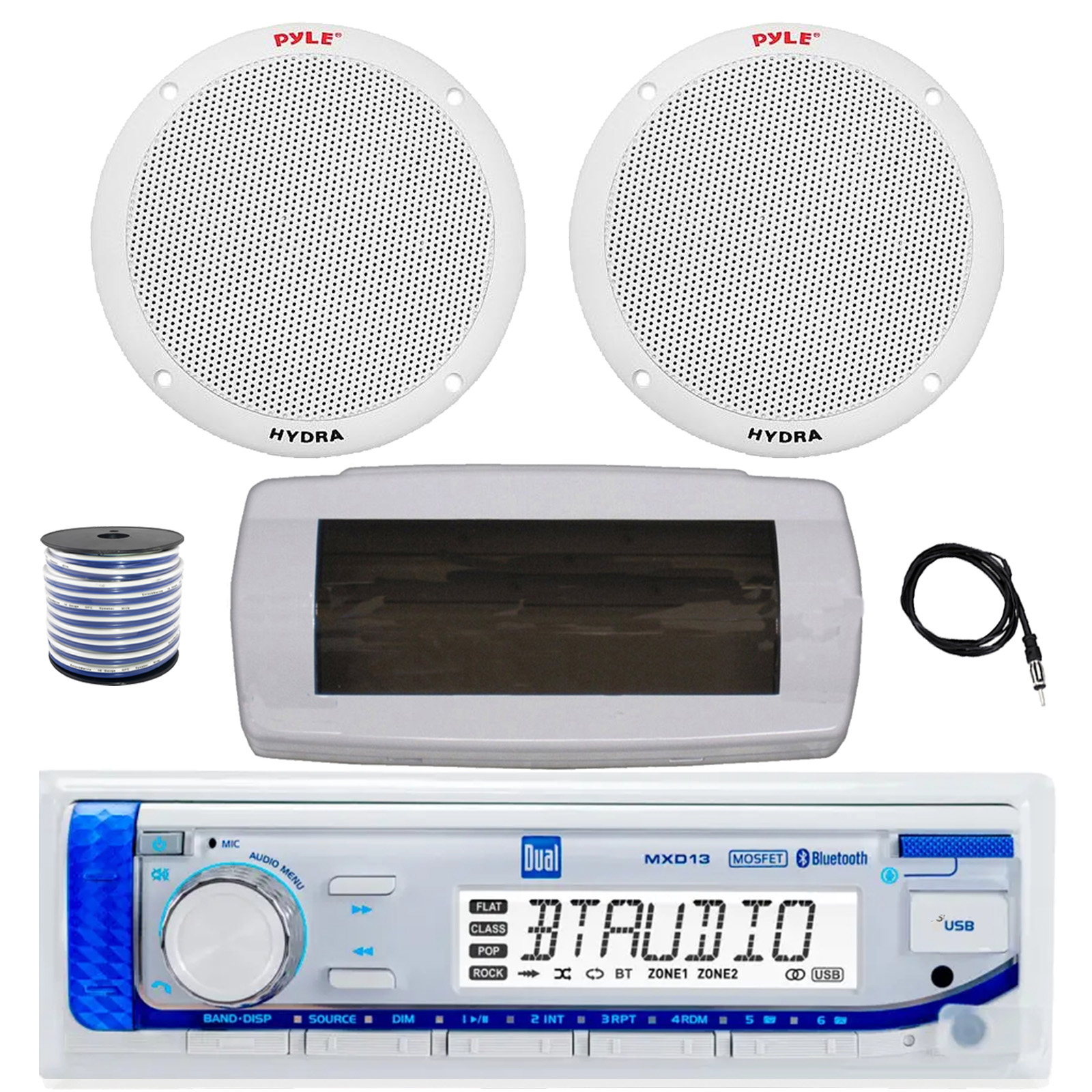 • PACKAGE BUNDLE INCLUDES: Dual MXD13 Single DIN Bluetooth Marine MP3 AM/FM Stereo Receiver with White Cover, 22" Radio Antenna, Wire, 2x 6.5'' 400W Peak 2-Way Full Range Dual Cone Waterproof Stereo Speakers (White)