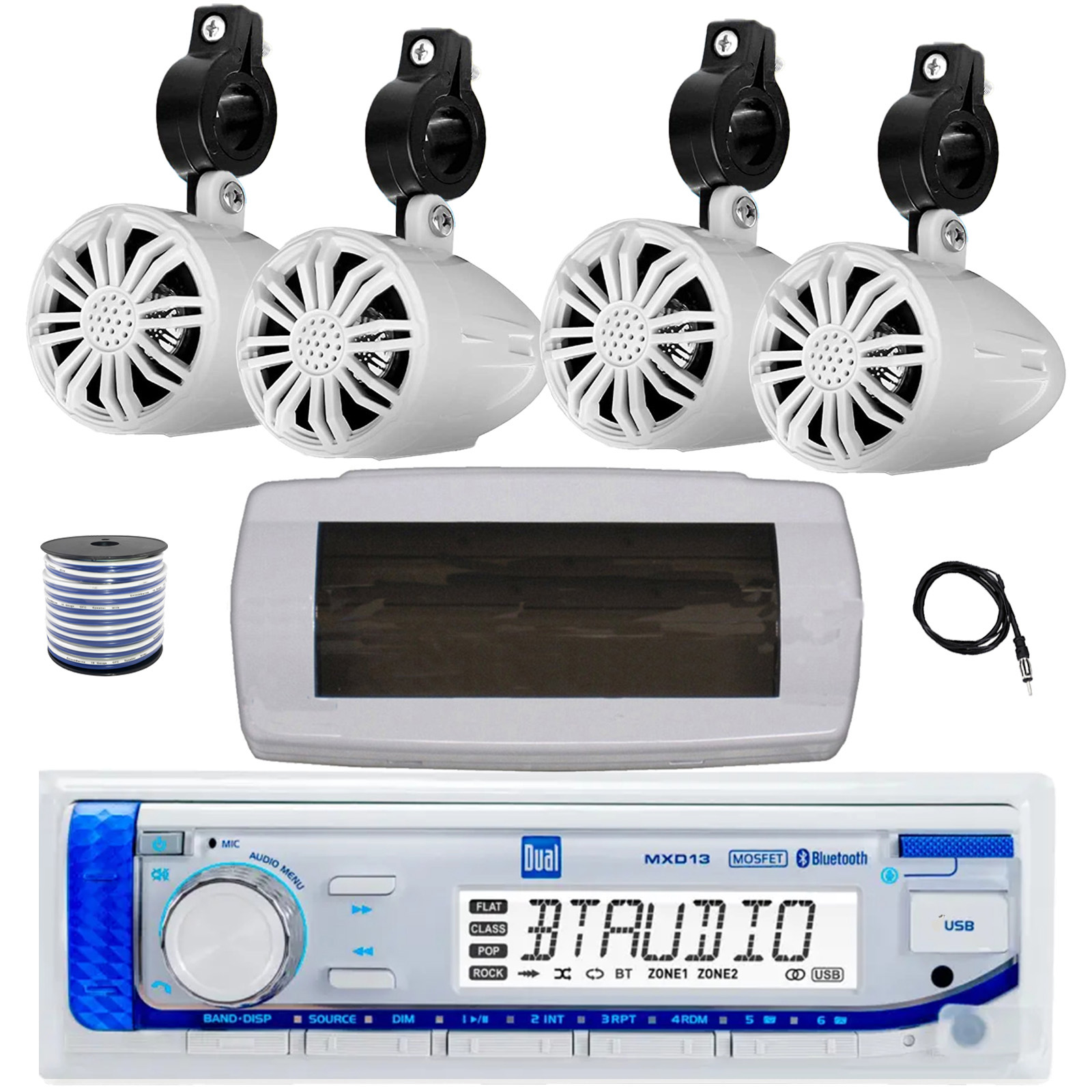 Dual Bluetooth Marine Receiver, Cover, Antenna,Wire, 4x 2.25" 10W White Speakers