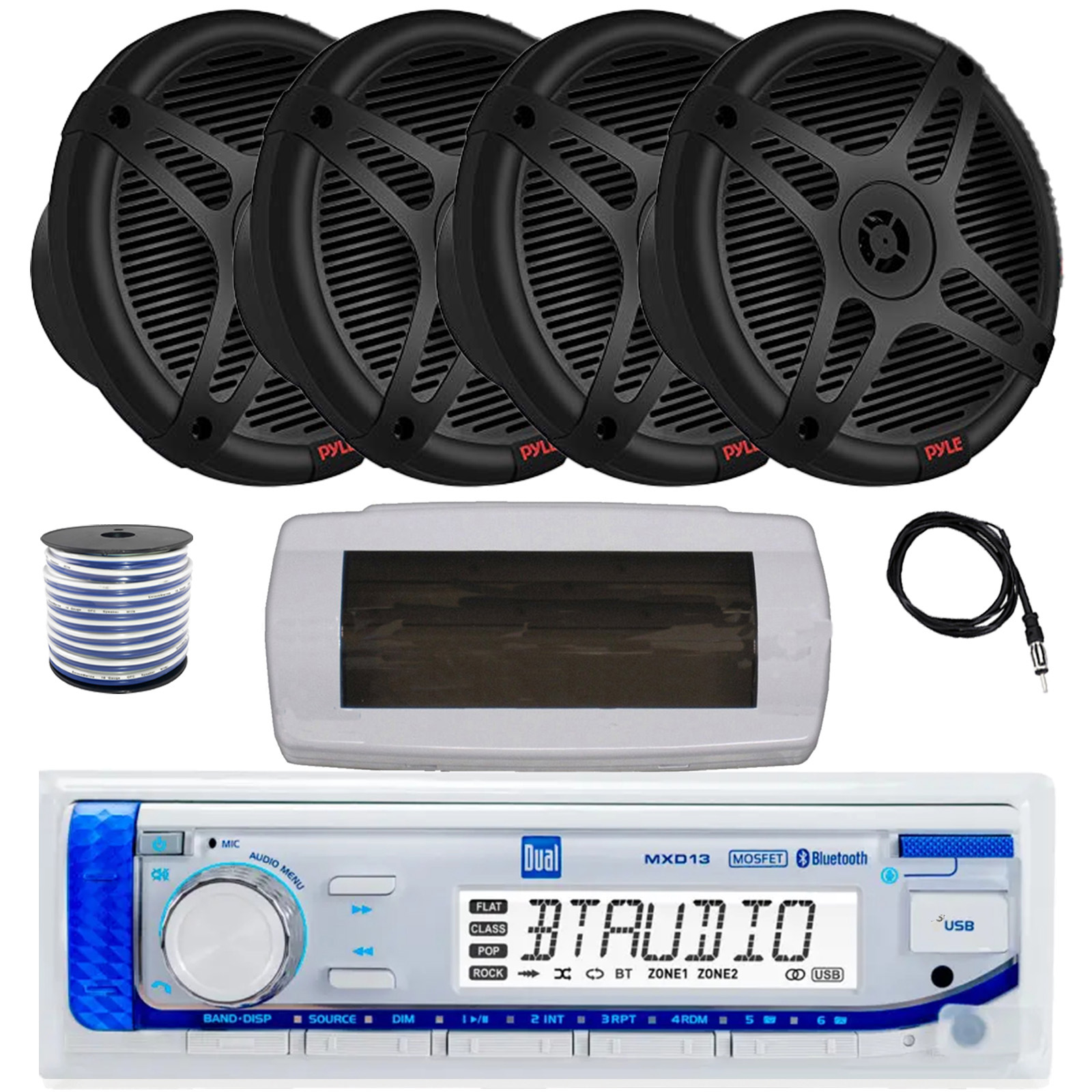 Dual MXD13 Single DIN Bluetooth Marine MP3 AM/FM Stereo Receiver with White Cover, 22" Radio Antenna, Wire, 4x 6.5" 600 Watt Max 2-Way Full Range Waterproof Wireless RF Streaming Speakers (Black)
