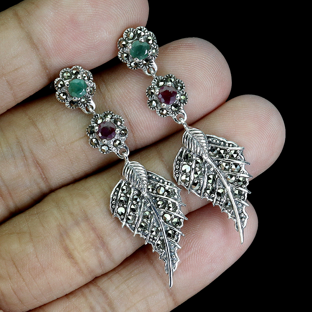 925 Sterling Silver Earrings Round Emerald Ruby Marcasite Gemstone Jewelry