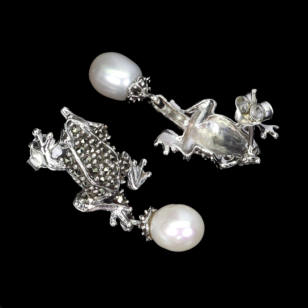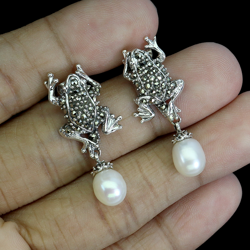 925 Sterling Silver Earrings Drop Pearl 9x8mm Marcasite Frog Gemstone Jewelry