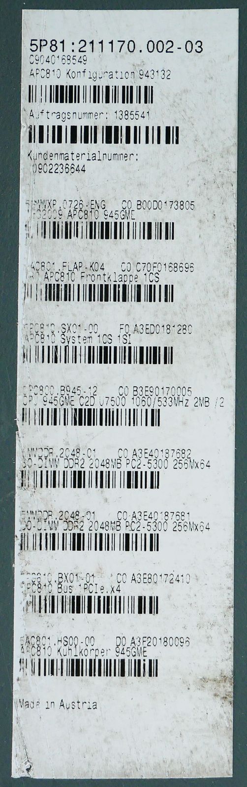 B&R 5PC810.SX01-00 Rev. F0 CPU 945GME C2D U7500 1060/533MHz 4GB RAM -used-