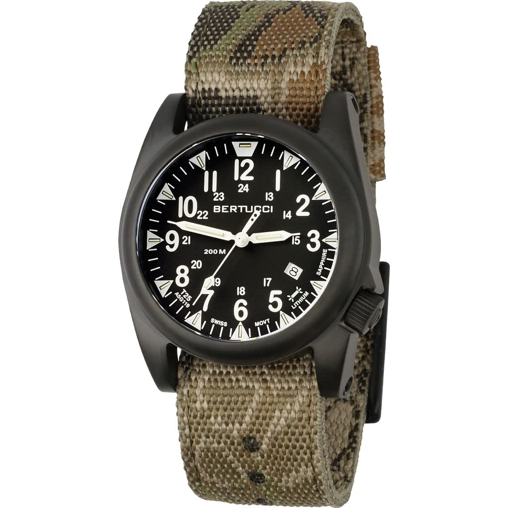 The A-6A Experiorâ 40 mm Unibodyâ case is made from light weight durable anodized aluminum. This innovative U.S. Patented design is clean and functionalâ creating a modern classic feel that can only come from Bertucci. Versatile, professional styling... well suited for lifeâs day to day endeavors. Precision movement, long lasting B-Type nylon band, 4 year battery and 100 M water resistance.