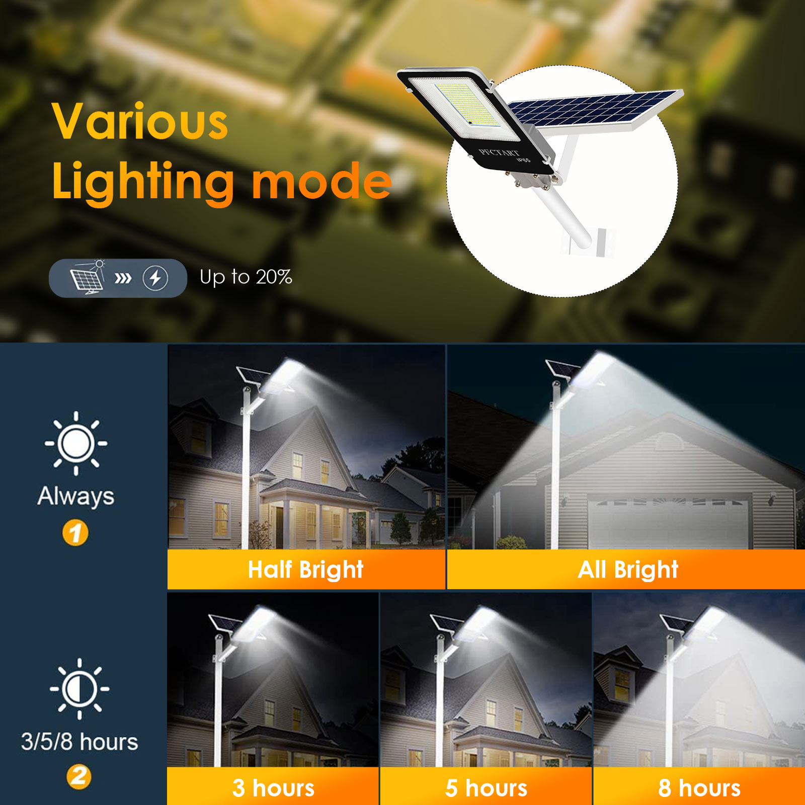 Built-in smart sensor,lights will turn on automatically at dusk, and turn off at dawn. Upgraded Remote Control -ON/OFF Function;Auto Mode- automatically lights up at night,automatically turns off during the day;Timing function-3H,5H,8H ;.Full / Half brightness mode;Brightness increase /decrease mode