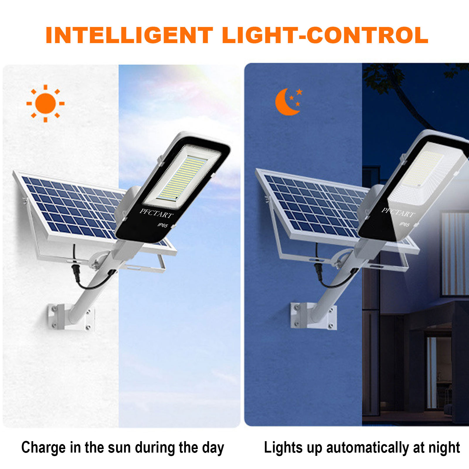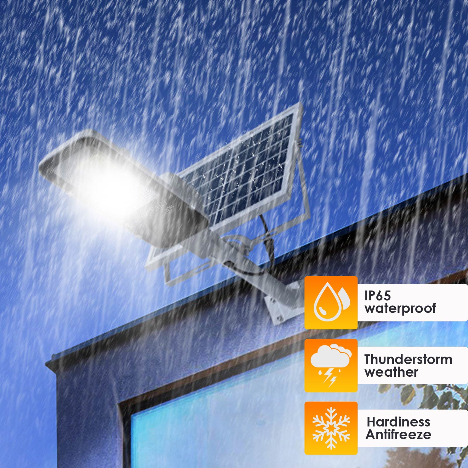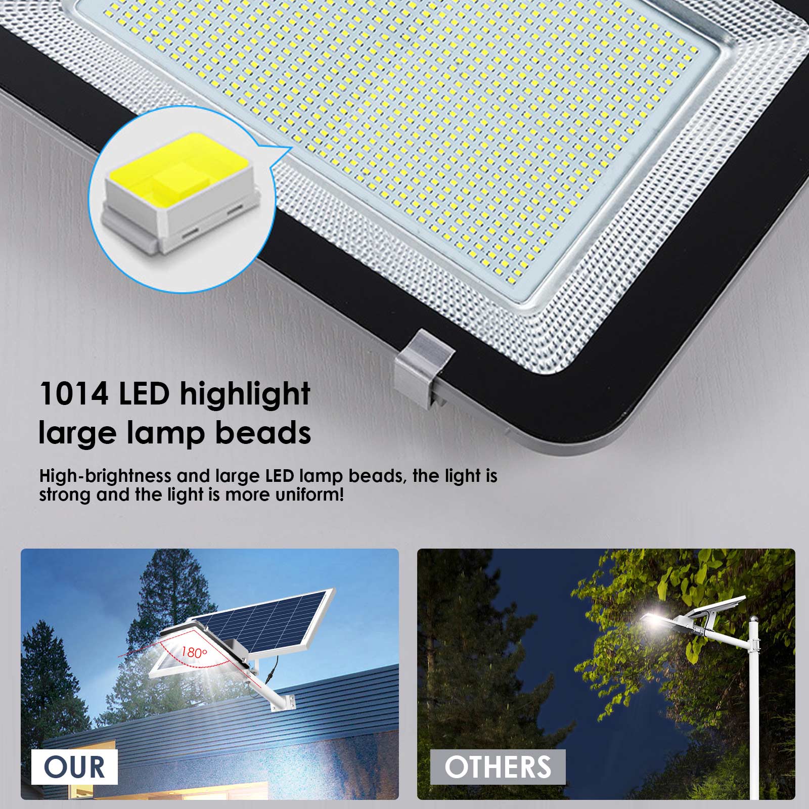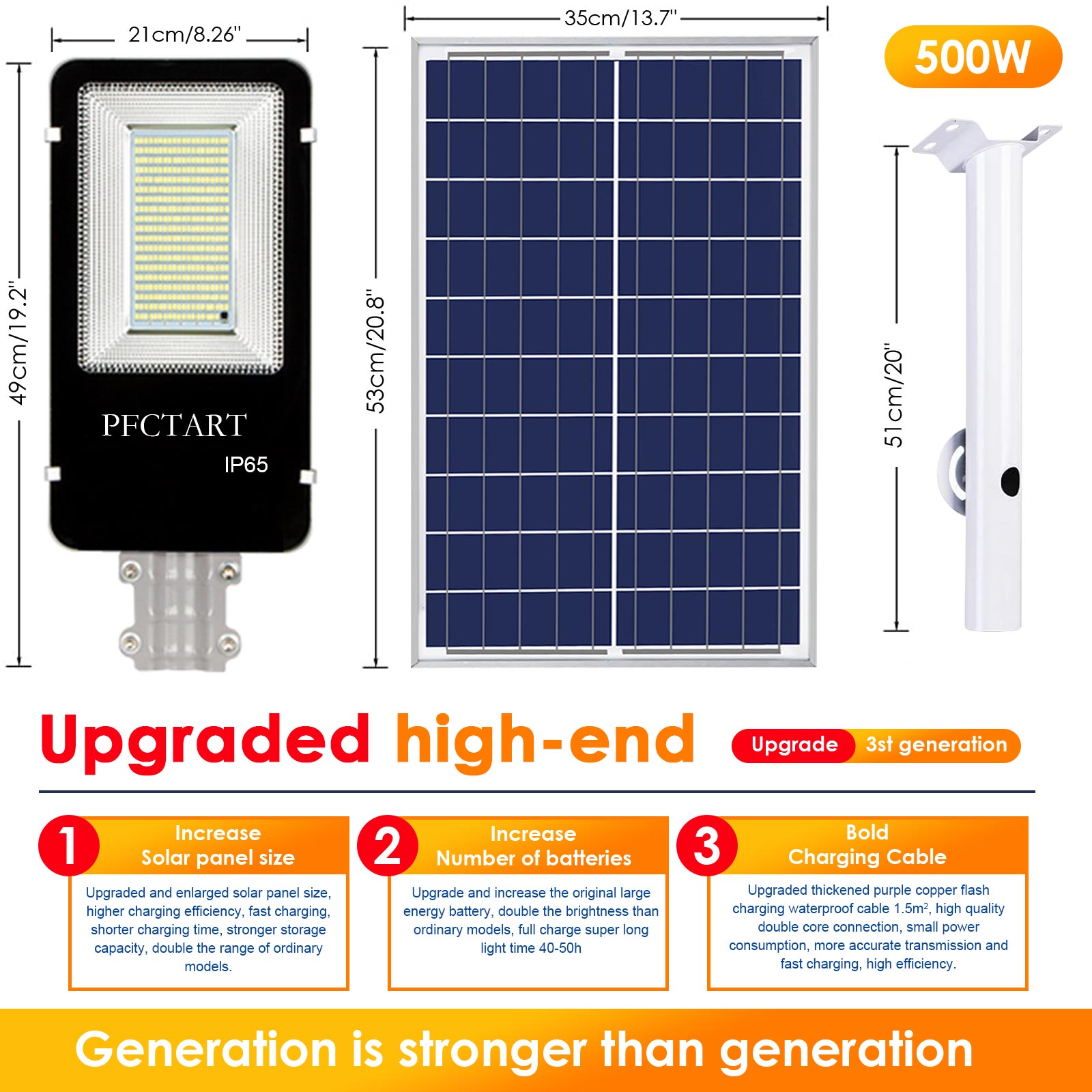 Equipped high quality 2835 SMD LED beads;Provides over 500W light 9900000 Lumens of brightness and reaches 200-300m² illumination range ;No struggle to see in dark places;Built-in 3.2v-13.5Ah large capacity lithium battery with a long life of 50,000+ hours;Working time is up to 20 hours after 4-6 hours fully charged,about 72 hours in dim mode.;Long-lasting and highly efficient solar panels,fast charging and high conversion rate