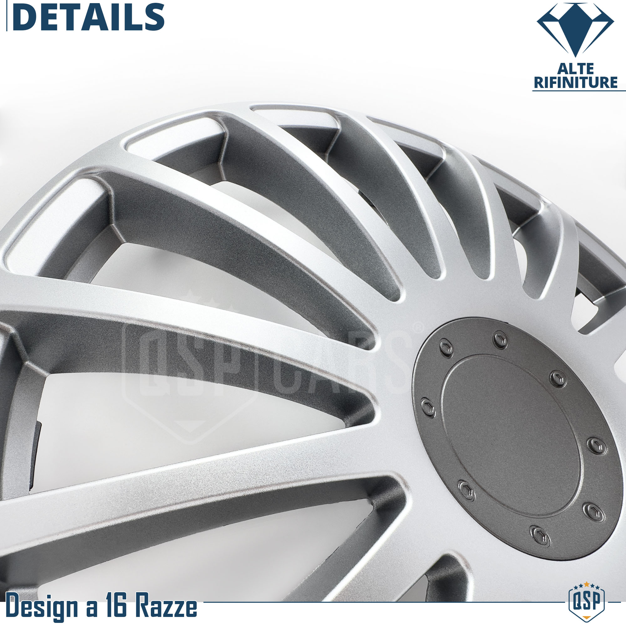 Design a 16 Razze, Silver, sono Ispirati ai Cerchi in Lega Sportivi dei più importanti Brand Automobilistici; di qualità Eccellente nella scelta dei materiali, Rifiniture del Dettaglio, tatto, e colorazione.