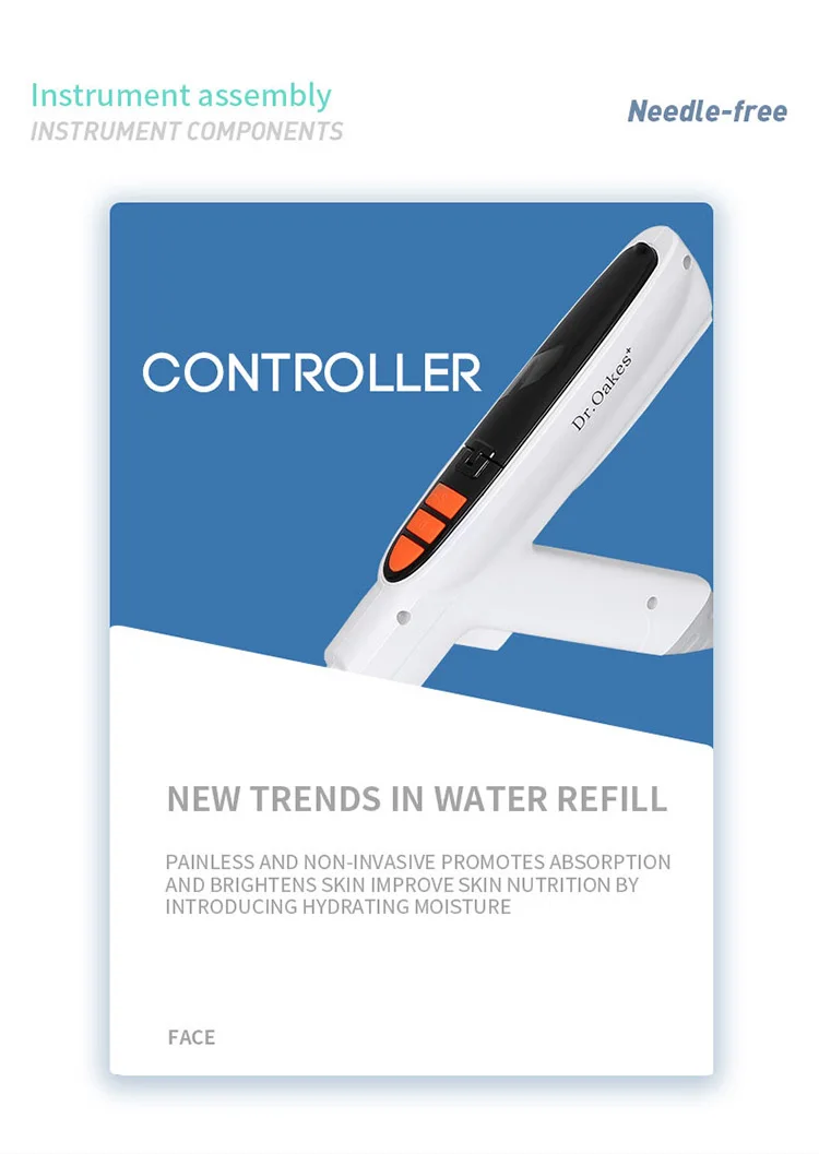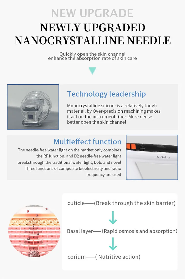 It serves as amultifunctional needle free waterlight instrument that integrates RF+ME. The use ofspecial EMS waveform combined with dual RF and singlecrystal silicon chips to act on different layers ofthe skin enhances the permeability of the product.breaking the new trend of needle free water lightachieving deep hydration and conduction, while alsoifting,tightening,rejuvenating,and whitening,solving the problem of skin absorption andeffectiveness, and achieving non-invasive andpainless treatment.