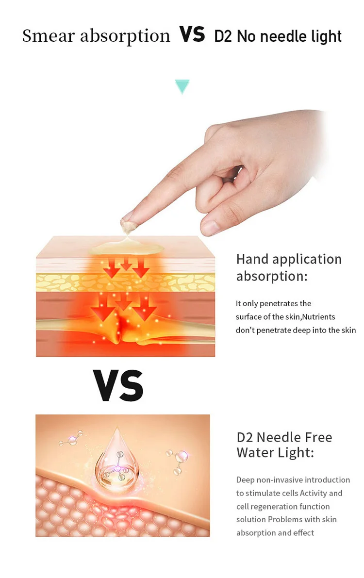 advantages01:Needle free water light is introduced into thedermis,repairing damaged and shriveled cells,stimulating collagen regeneration, and completingwater locking and moisturizing;